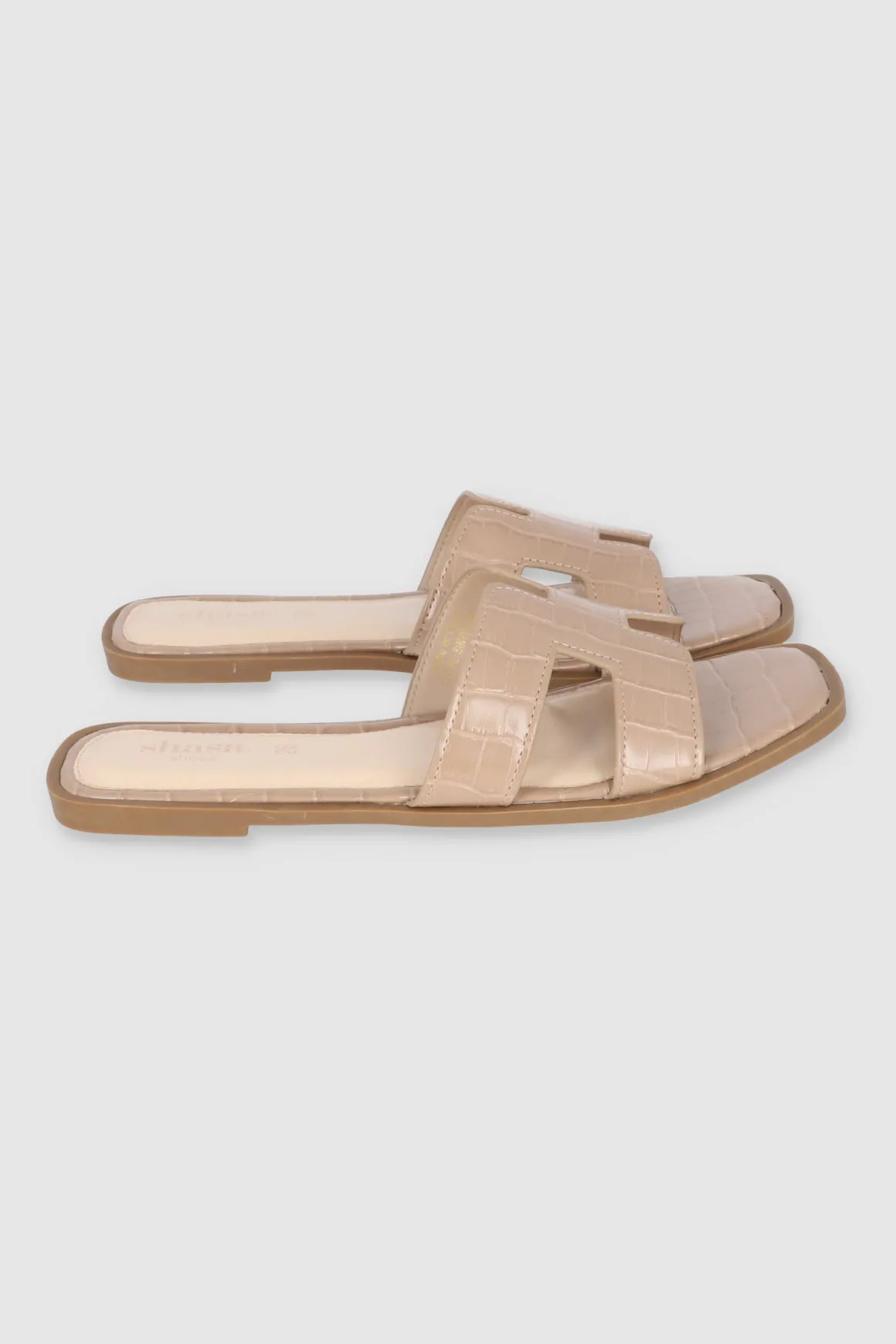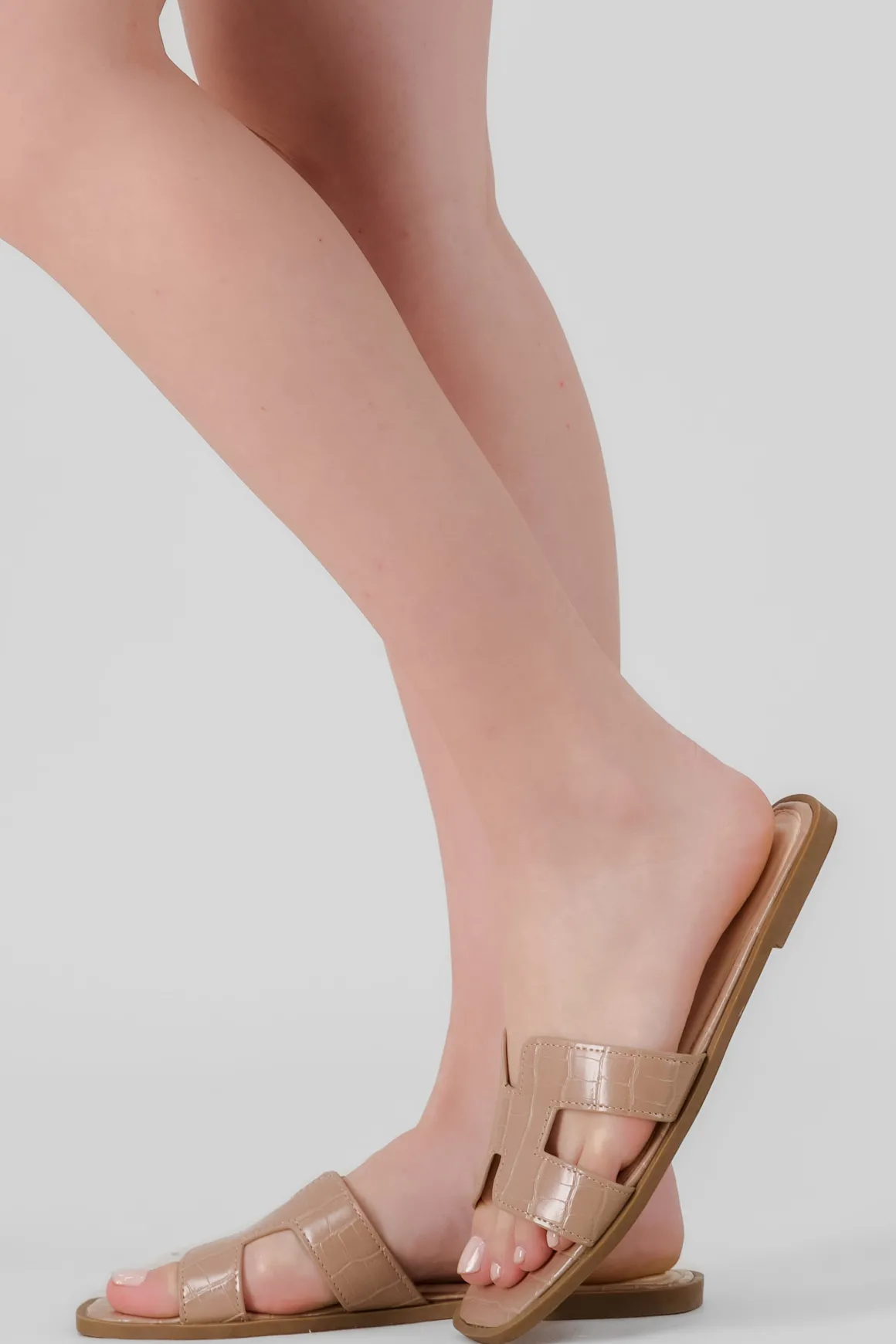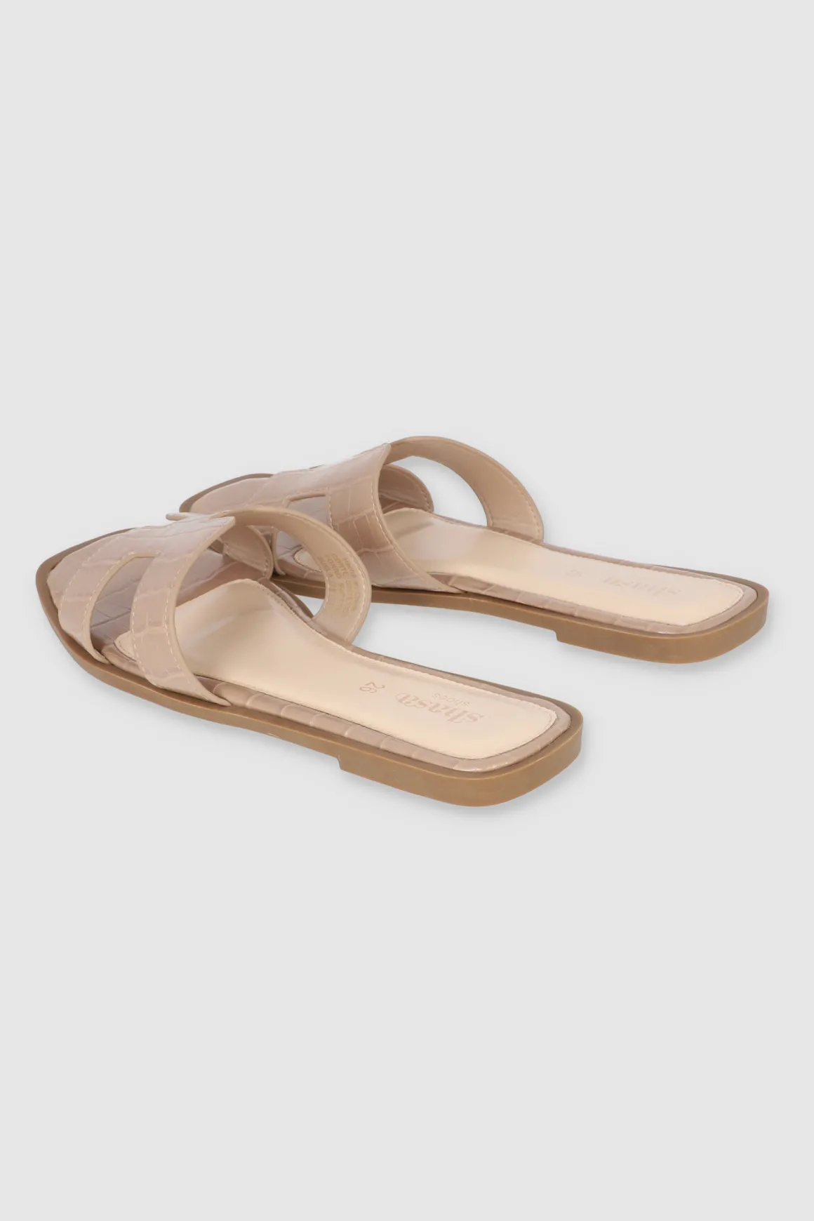 Estas sandalias planas presentan un diseño clásico con un toque moderno. La textura en croco en la cinta superior agrega un detalle interesante, ideal para cualquier outfit diario.