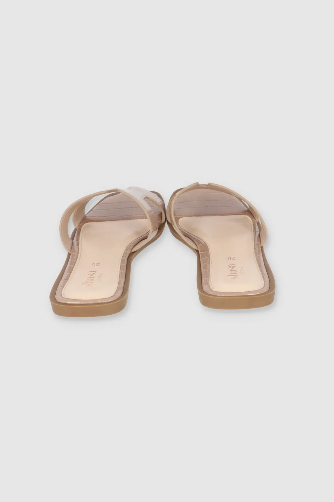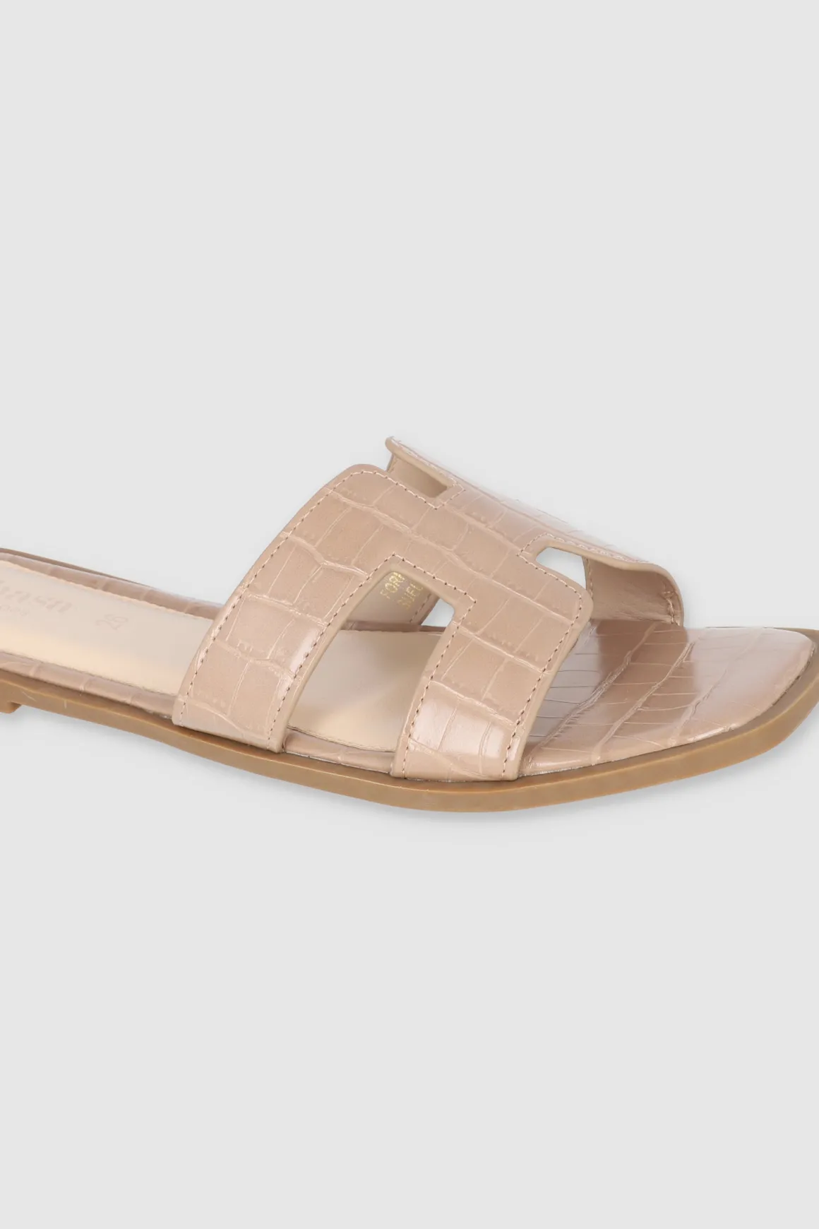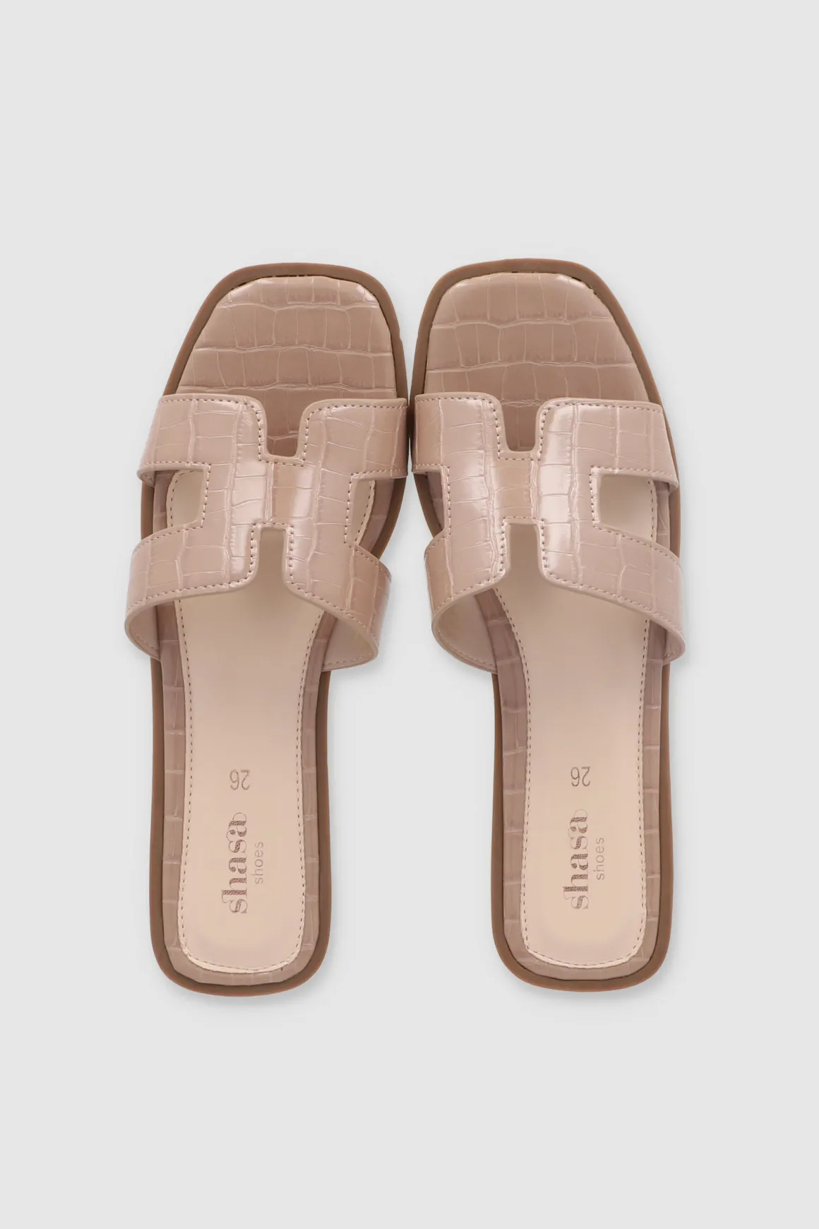 Estas sandalias planas presentan un diseño clásico con un toque moderno. La textura en croco en la cinta superior agrega un detalle interesante, ideal para cualquier outfit diario.
