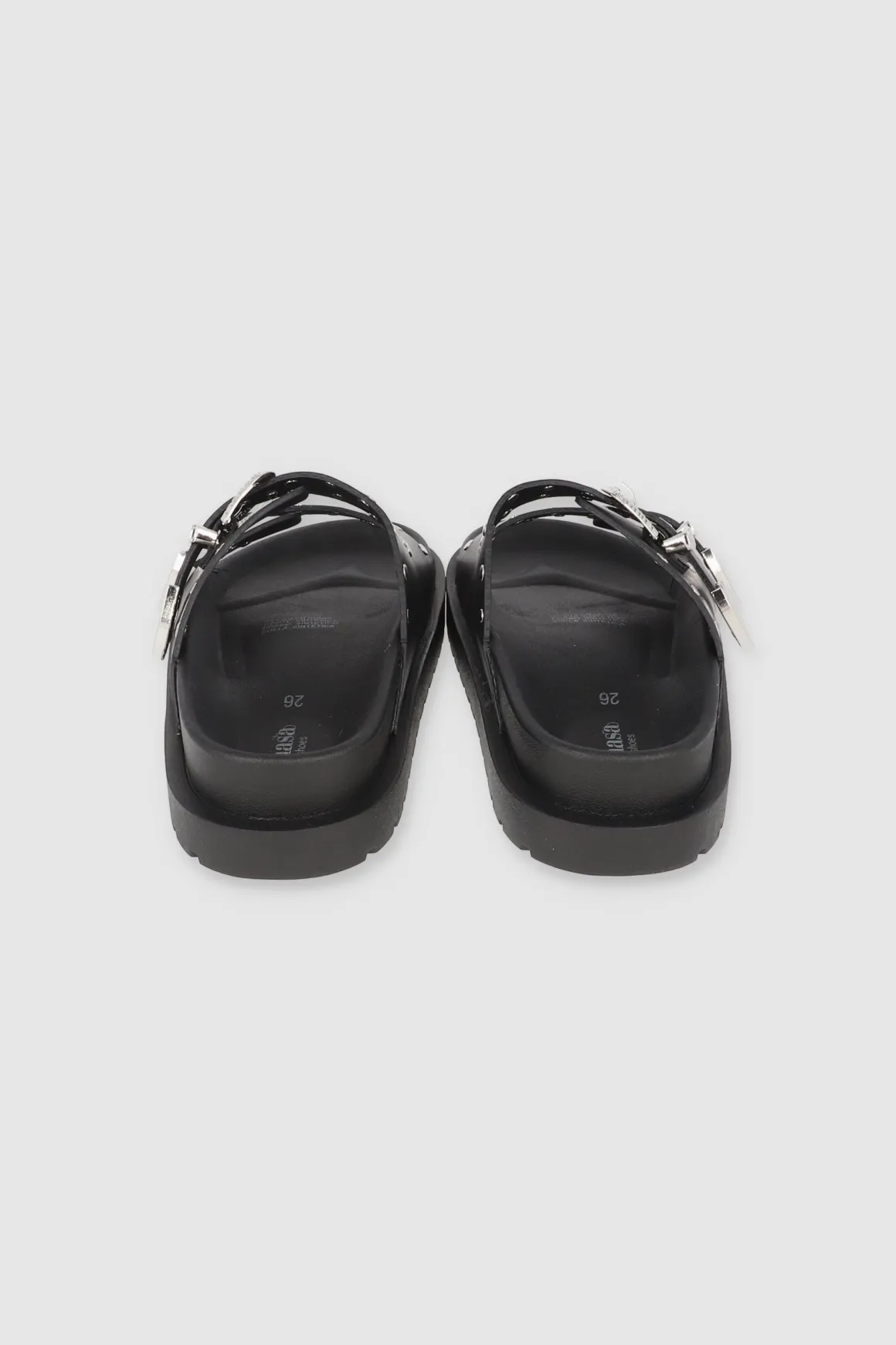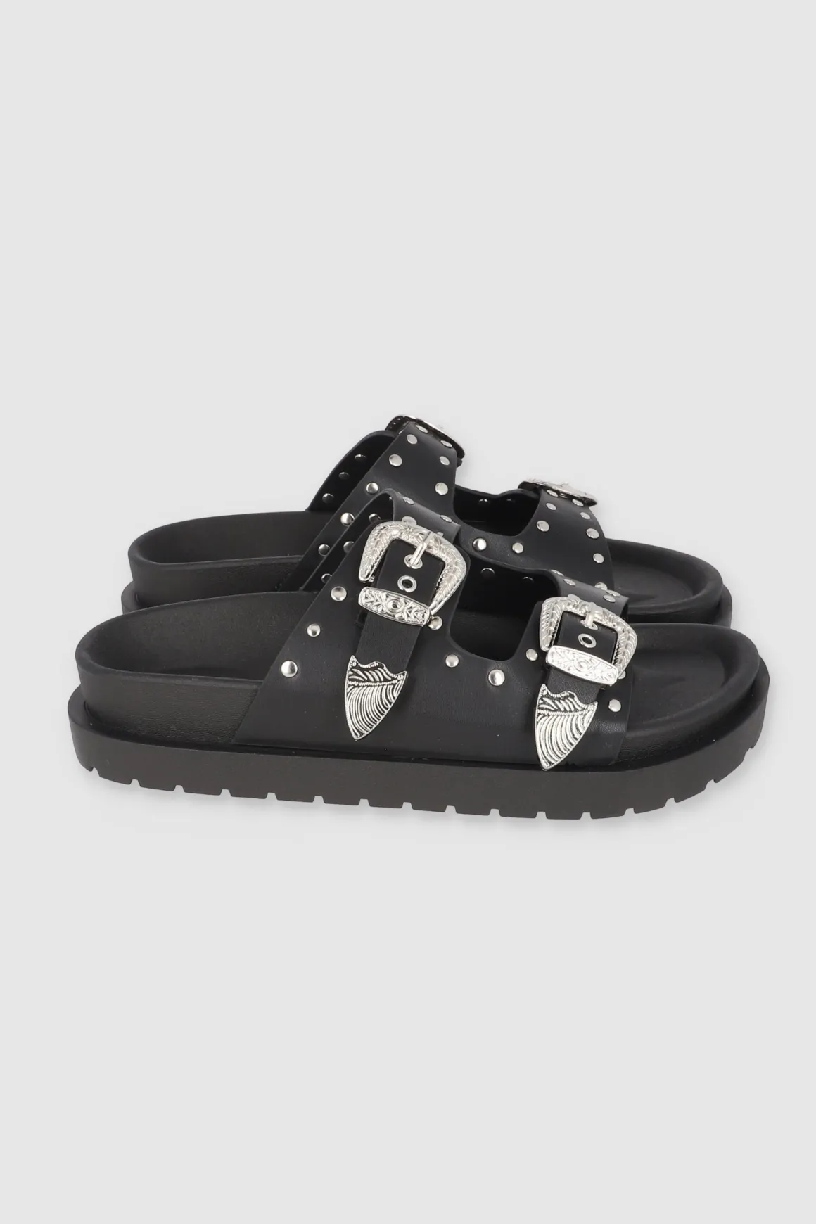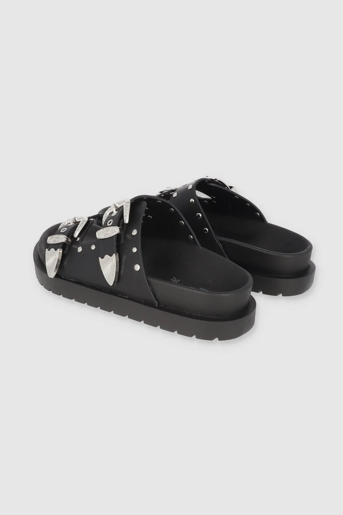 Dale un toque audaz a tu estilo con nuestras sandalias de suela ancha, perfectas para destacar en cualquier ocasión. Estas sandalias combinan comodidad y diseño atrevido, ideales para tus outfits más cool. La doble cinta ancha con hebillas chunky y decoración de studs añade un detalle llamativo que elevará tu look al siguiente nivel.