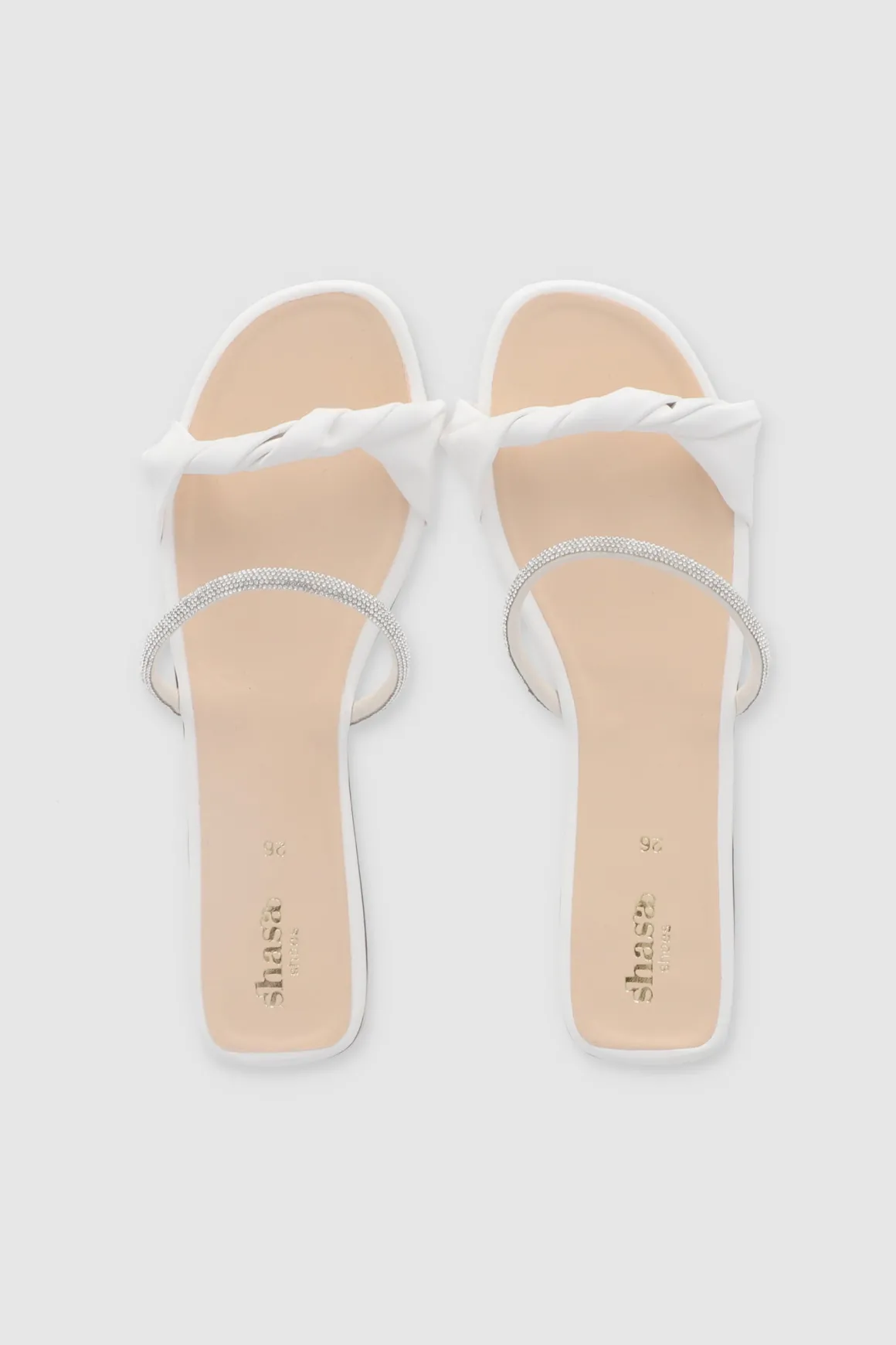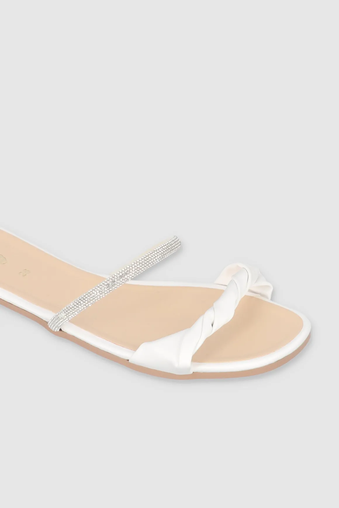 Estas sandalias planas son todo lo que necesitas para darle un toque moderno a tu outfit. Con una cinta superior con detalle de nudo y una tira delgada con aplicación de brillos, son ideales para cualquier ocasión. Perfectas para combinar con tus jeans favoritos o un vestido veraniego, estas sandalias son la opción perfecta para mantener tu look fresco y a la moda.