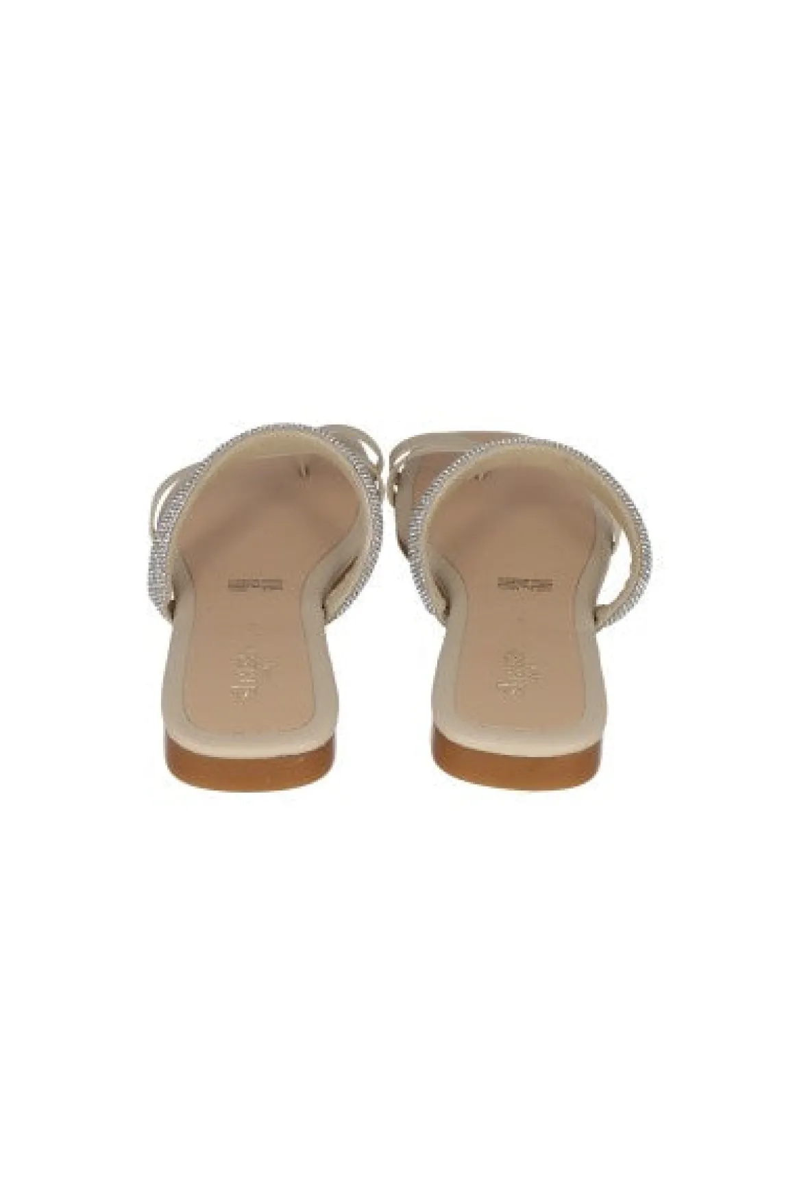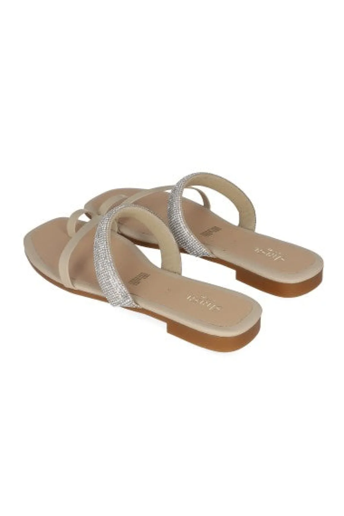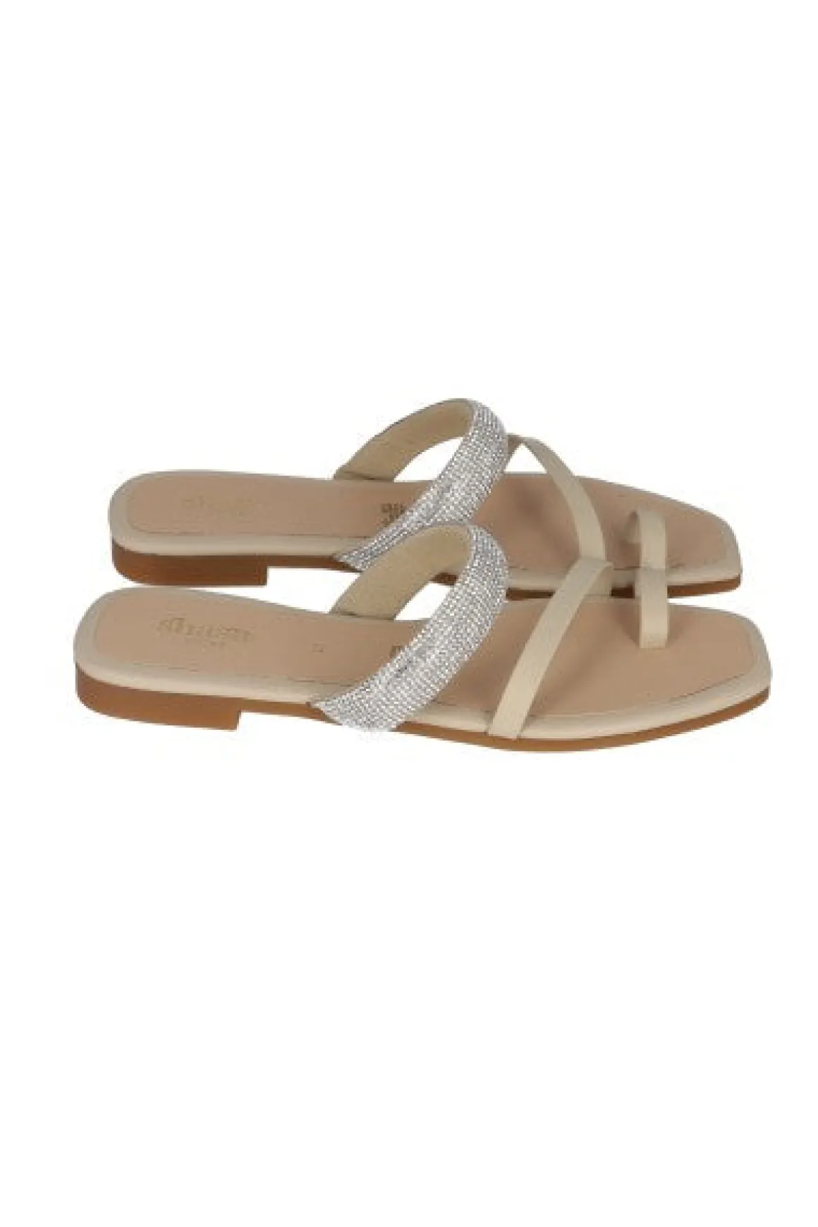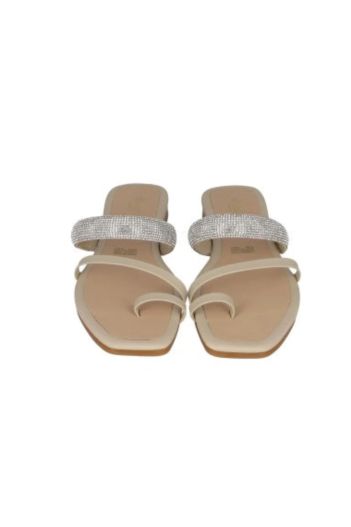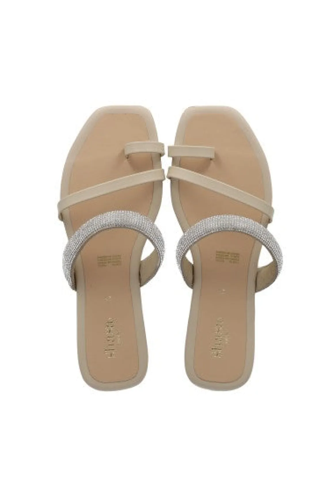 Sandalias pala con punta cuadrada y tira ancha en empeine con brillos. Tira frontal y anillo para dedo en efecto piel.