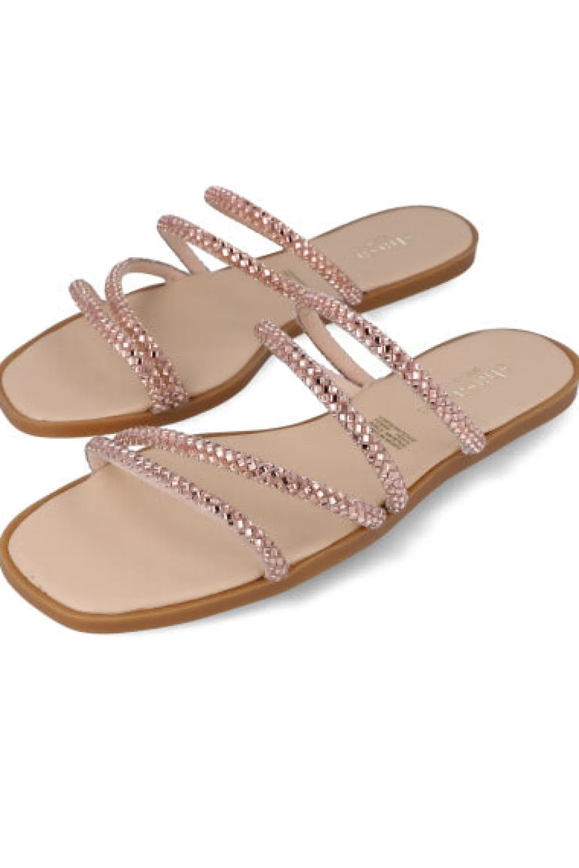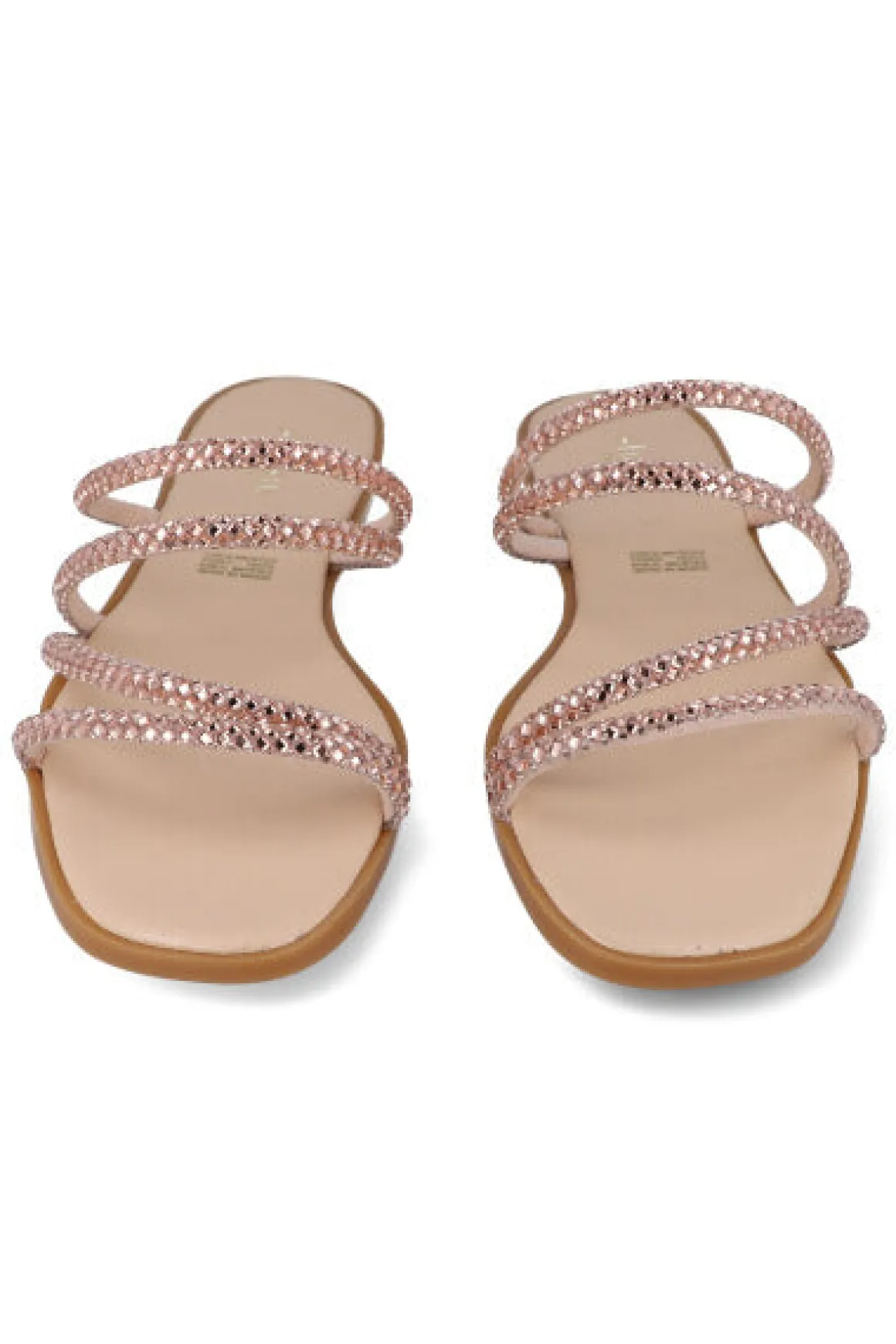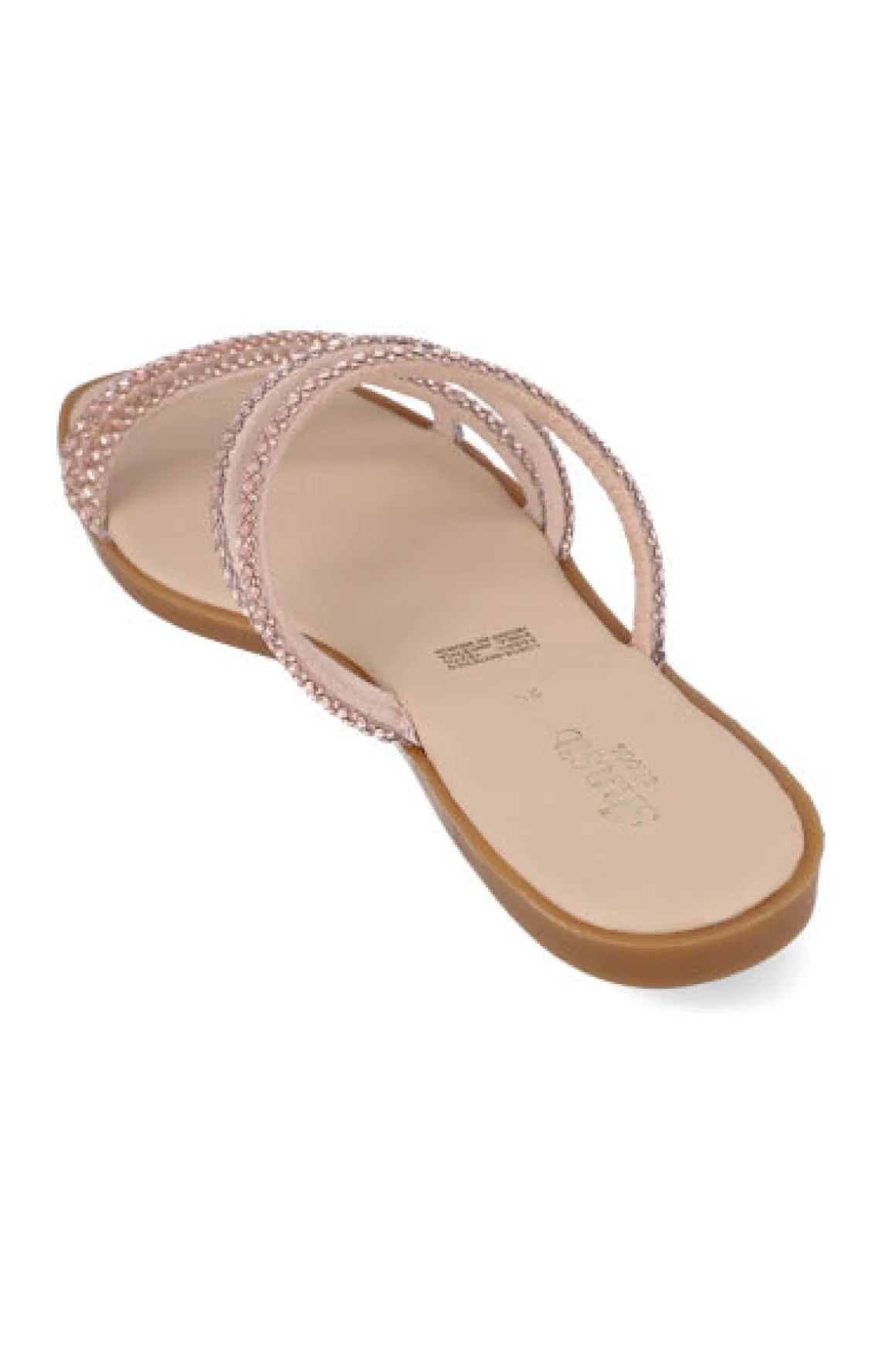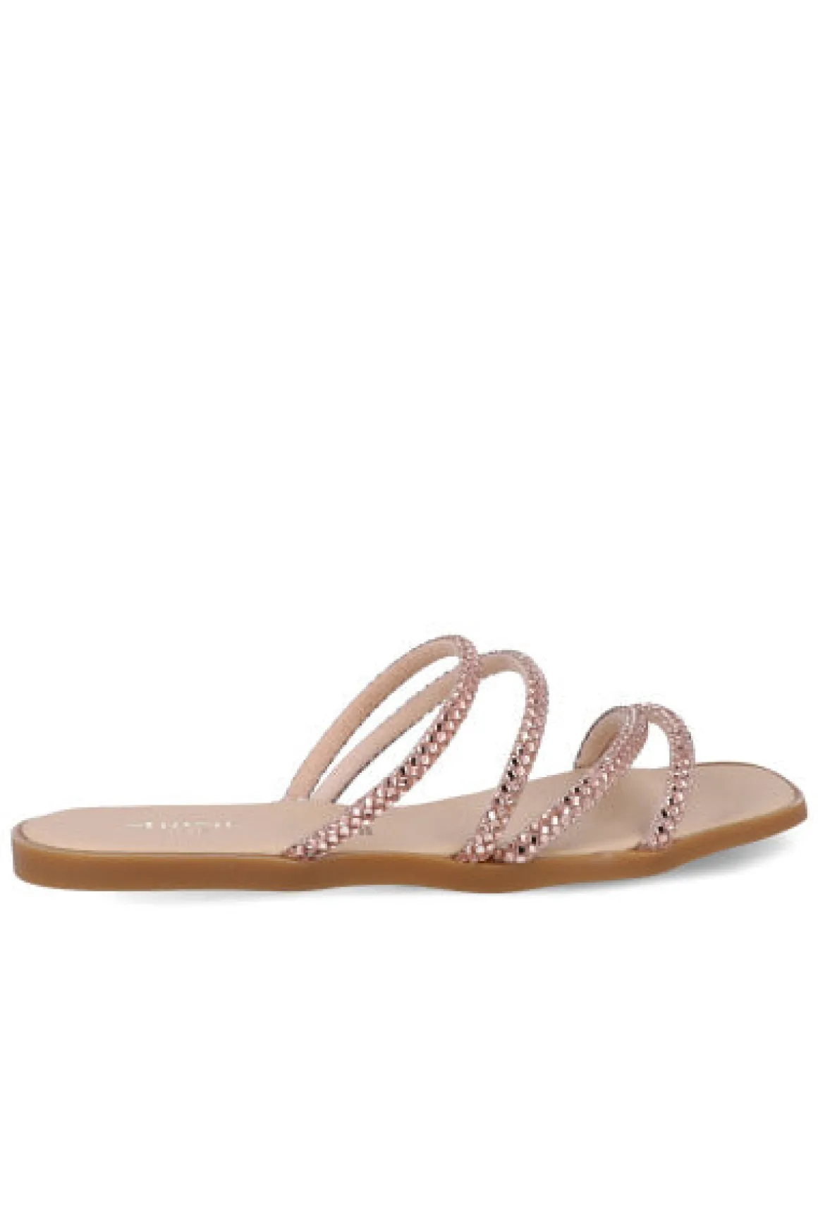 Deslumbra con estas sandalias tipo slide que combinan estilo y glamour en cada paso. Con tiras decoradas con brillantes tipo spiky que añaden un toque de brillo y sofisticación, estas sandalias son ideales para completar tu look de verano con un toque de elegancia audaz.