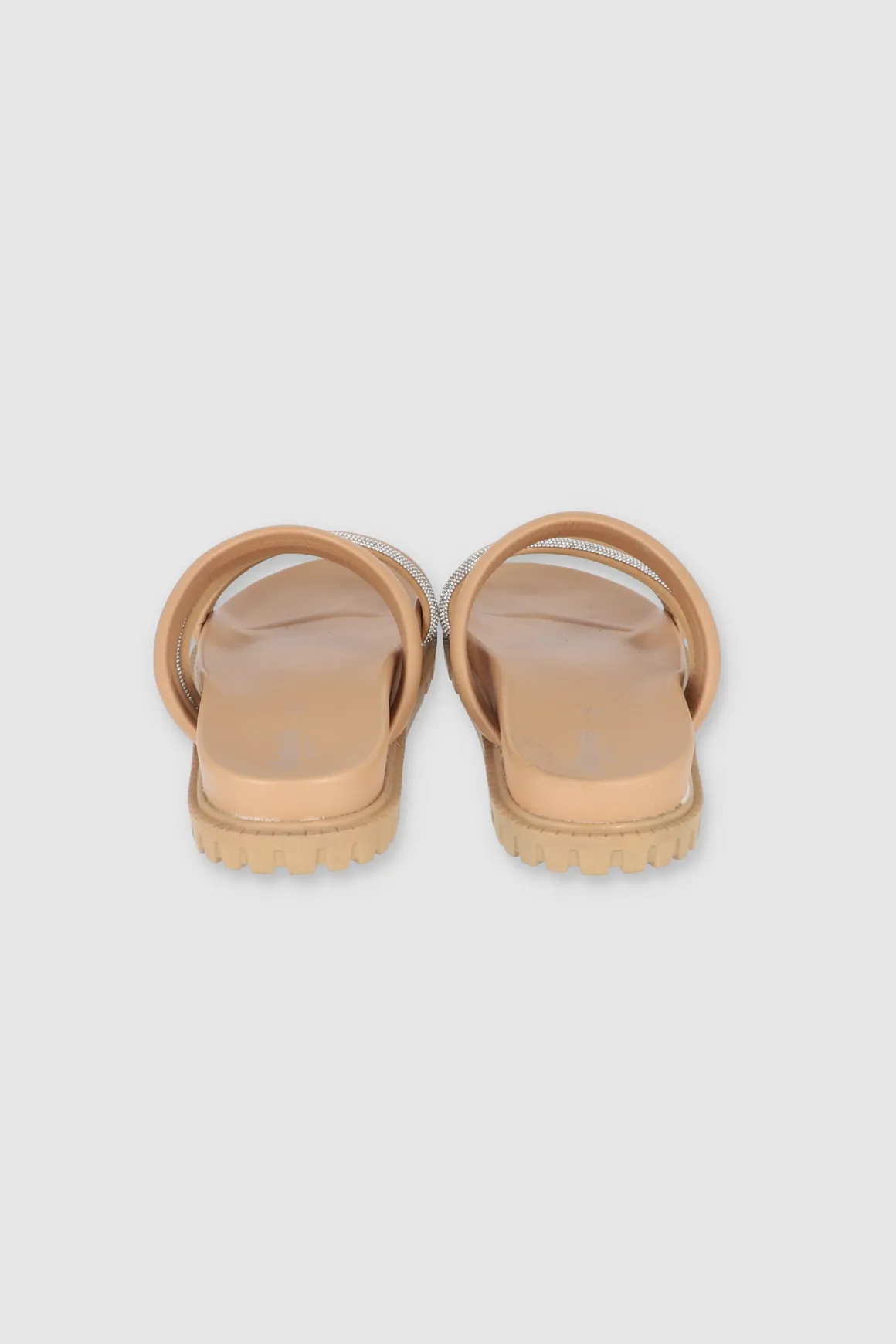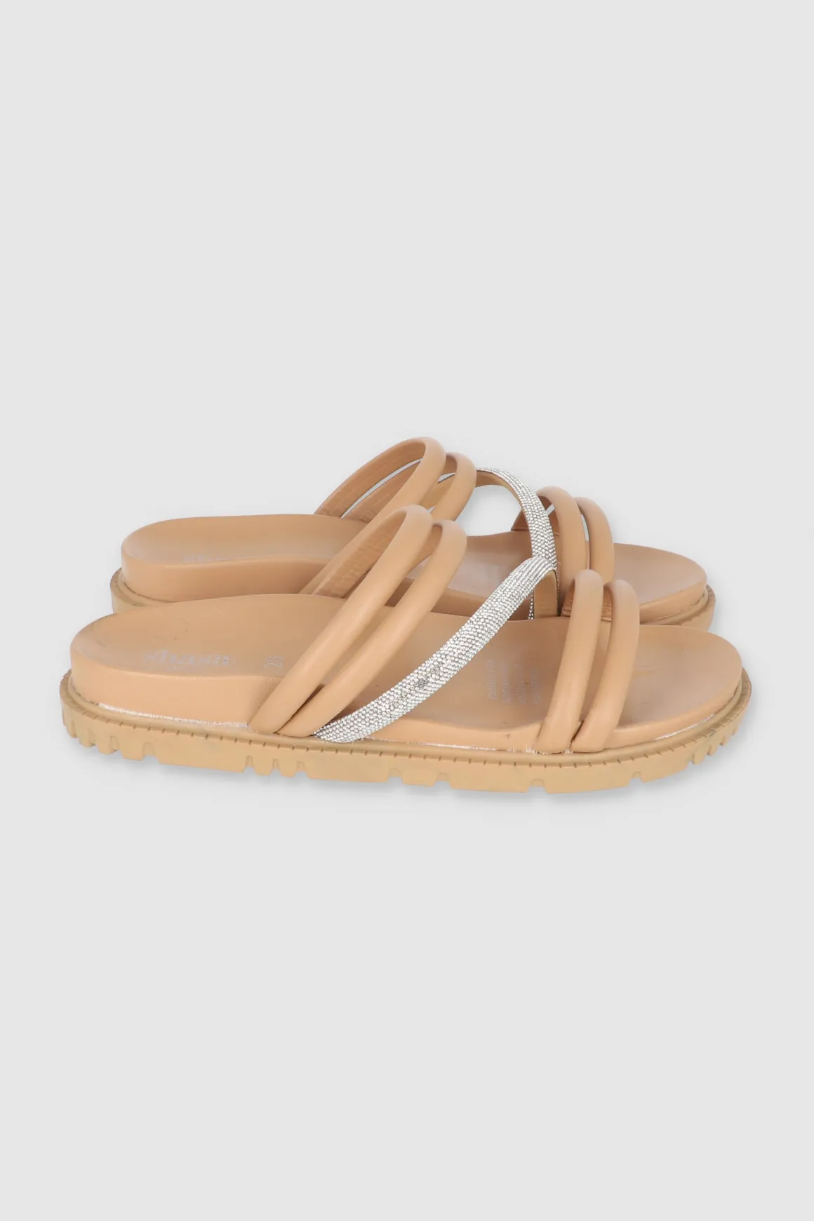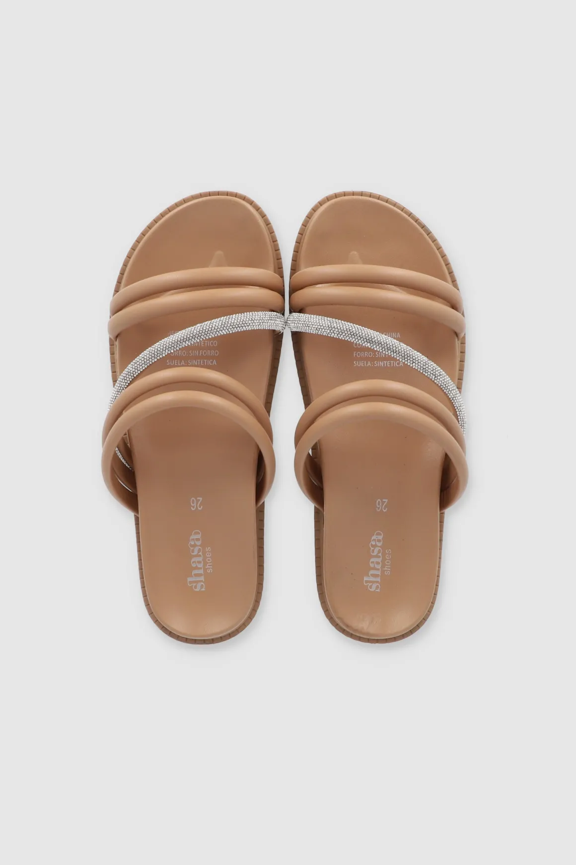 Completa tu look con nuestras sandalias de suela gruesa, perfectas para destacar en cualquier ocasión. Estas sandalias combinan estilo y comodidad con sus multi cintas superiores delgadas en tonos lisos, mientras que una de las cintas lleva una aplicación de brillos en contraste, añadiendo un toque especial a tu outfit. Perfectas para salir con amigas o disfrutar de un día soleado.
