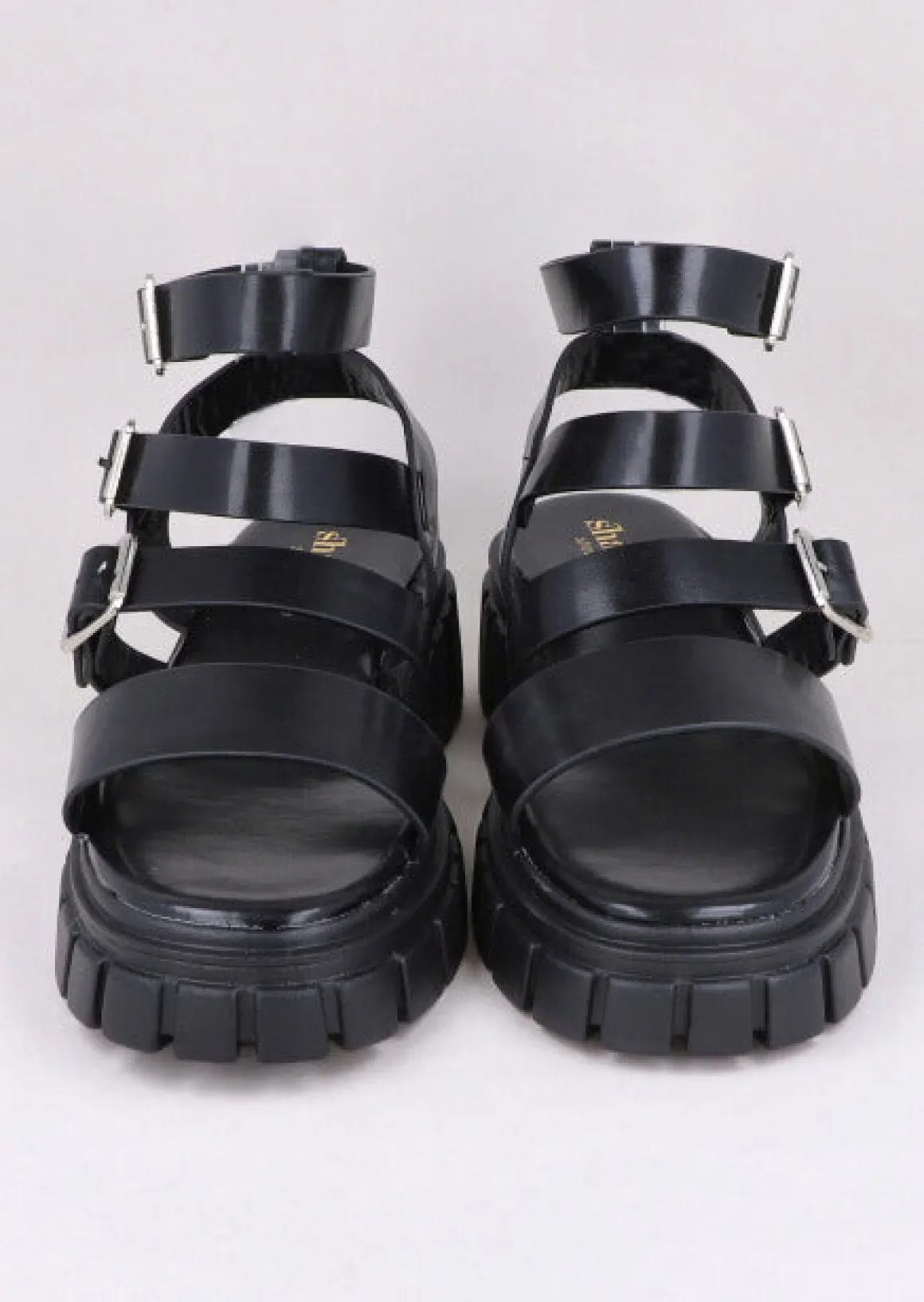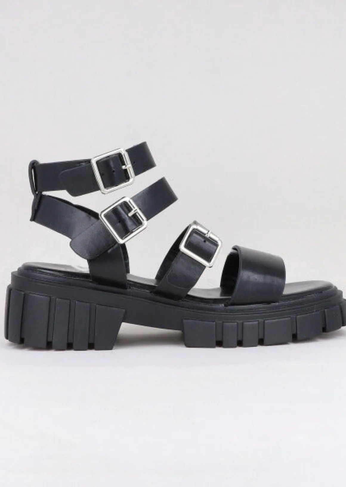 Sandalías chunky con tiras triples en la parte superior y correa de ajuste para tobillo con hebilla.