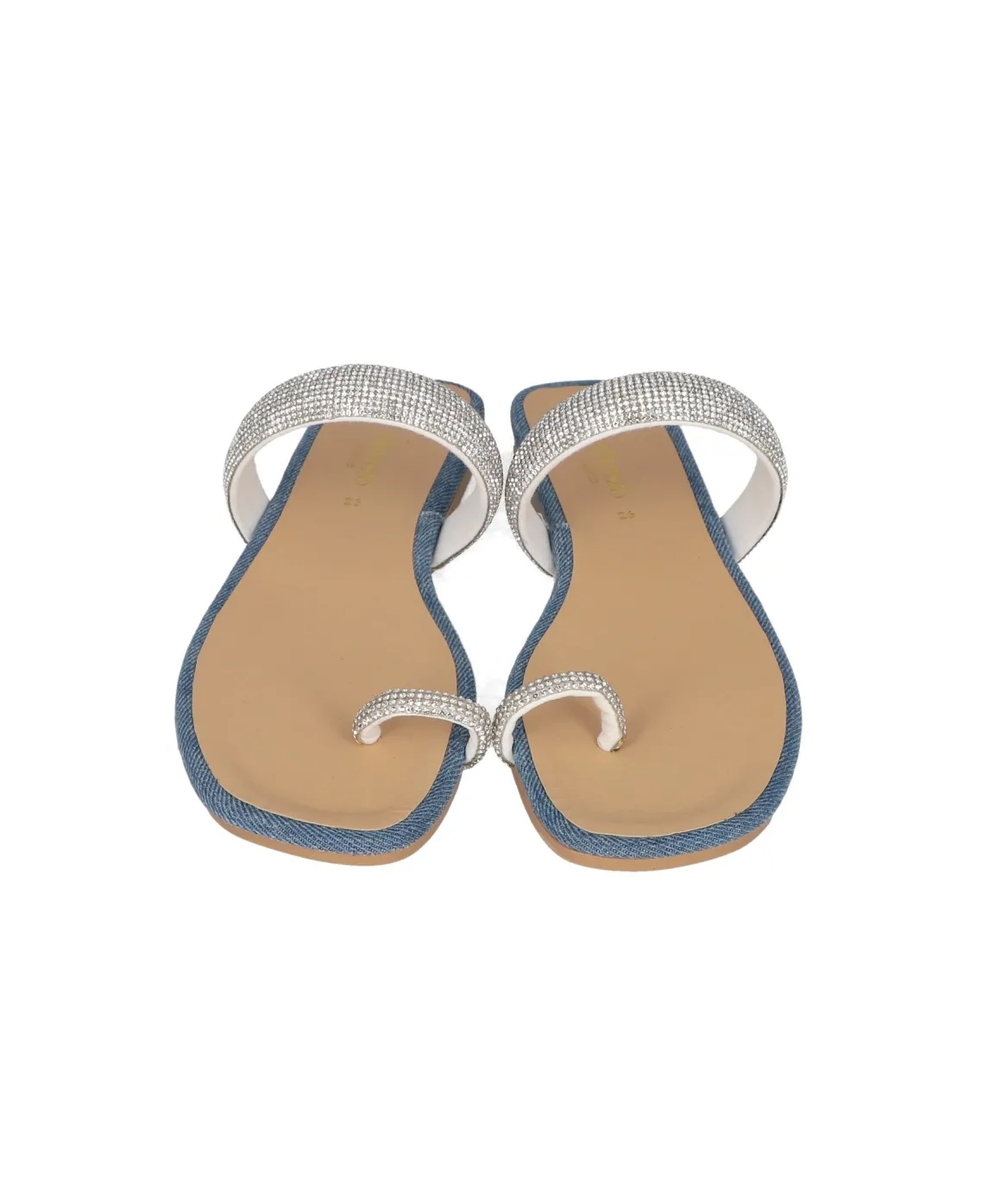 Sandalias pala de efecto piel y punta redonda. Tira frontal y anillo para dedo con brillos. Plataforma 4 cm.