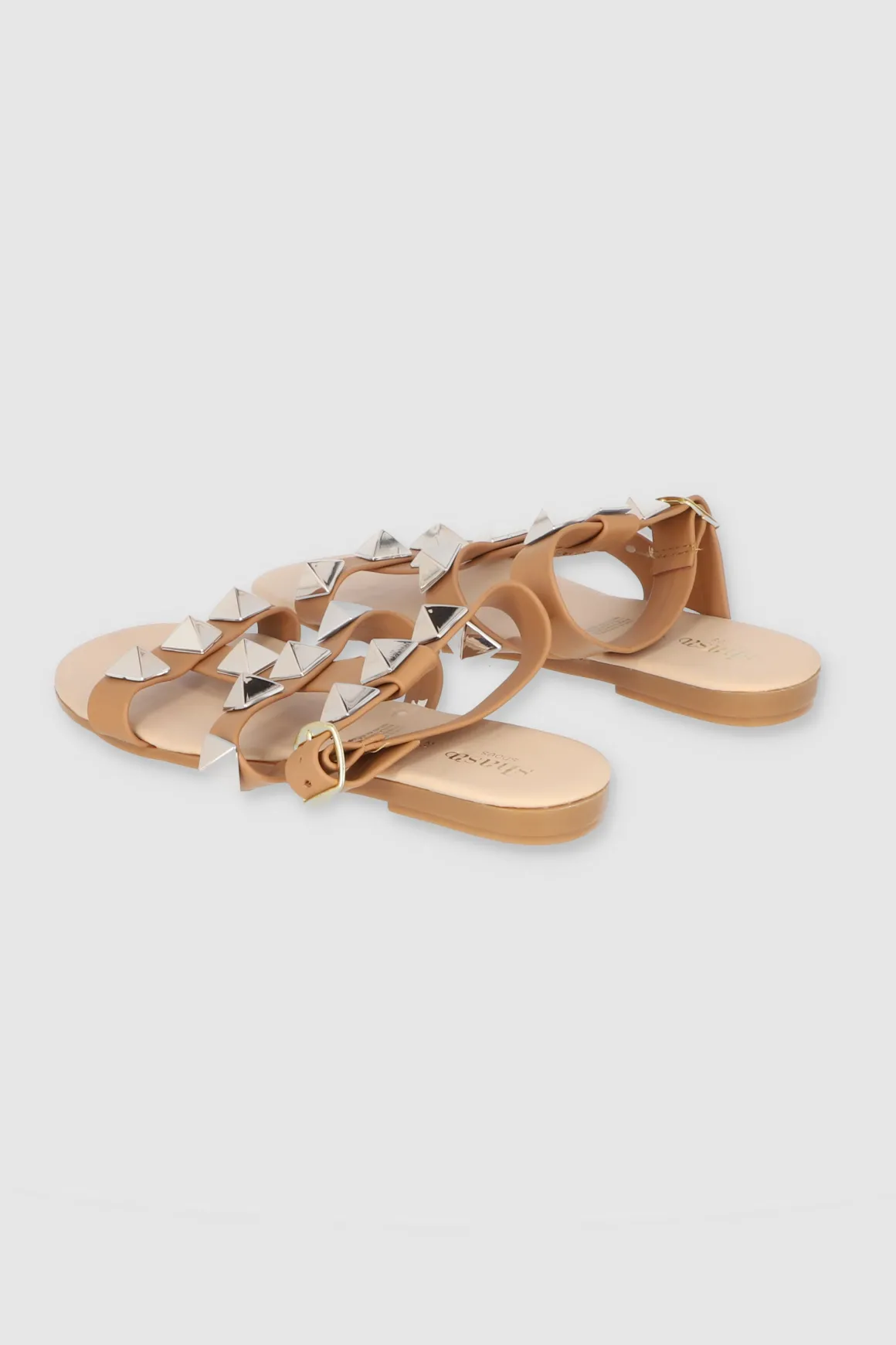 Sandalias plana gladiador punta redonda. Tiras con estoperoles maxi. Cierre mediante pulsera al tobillo.