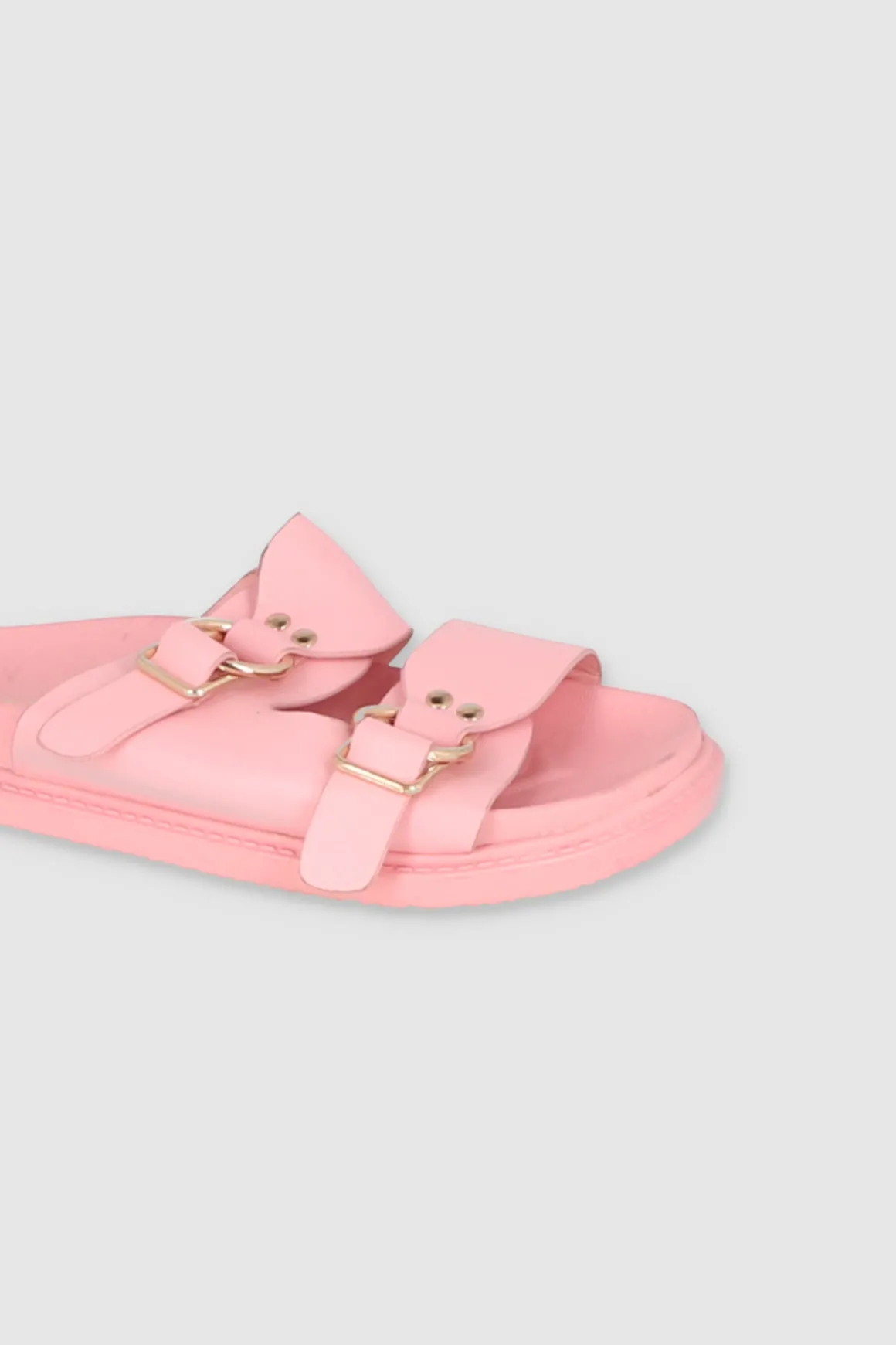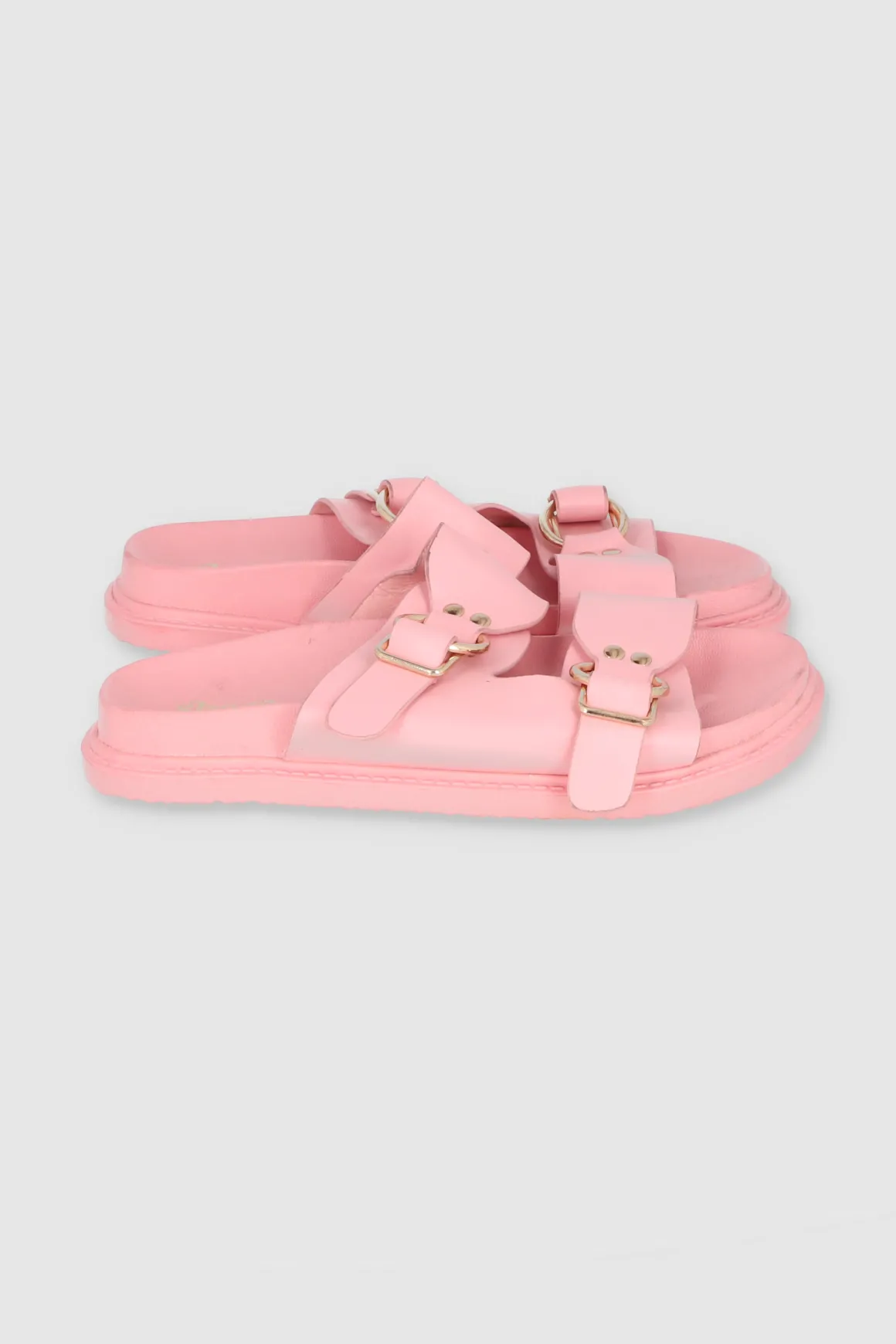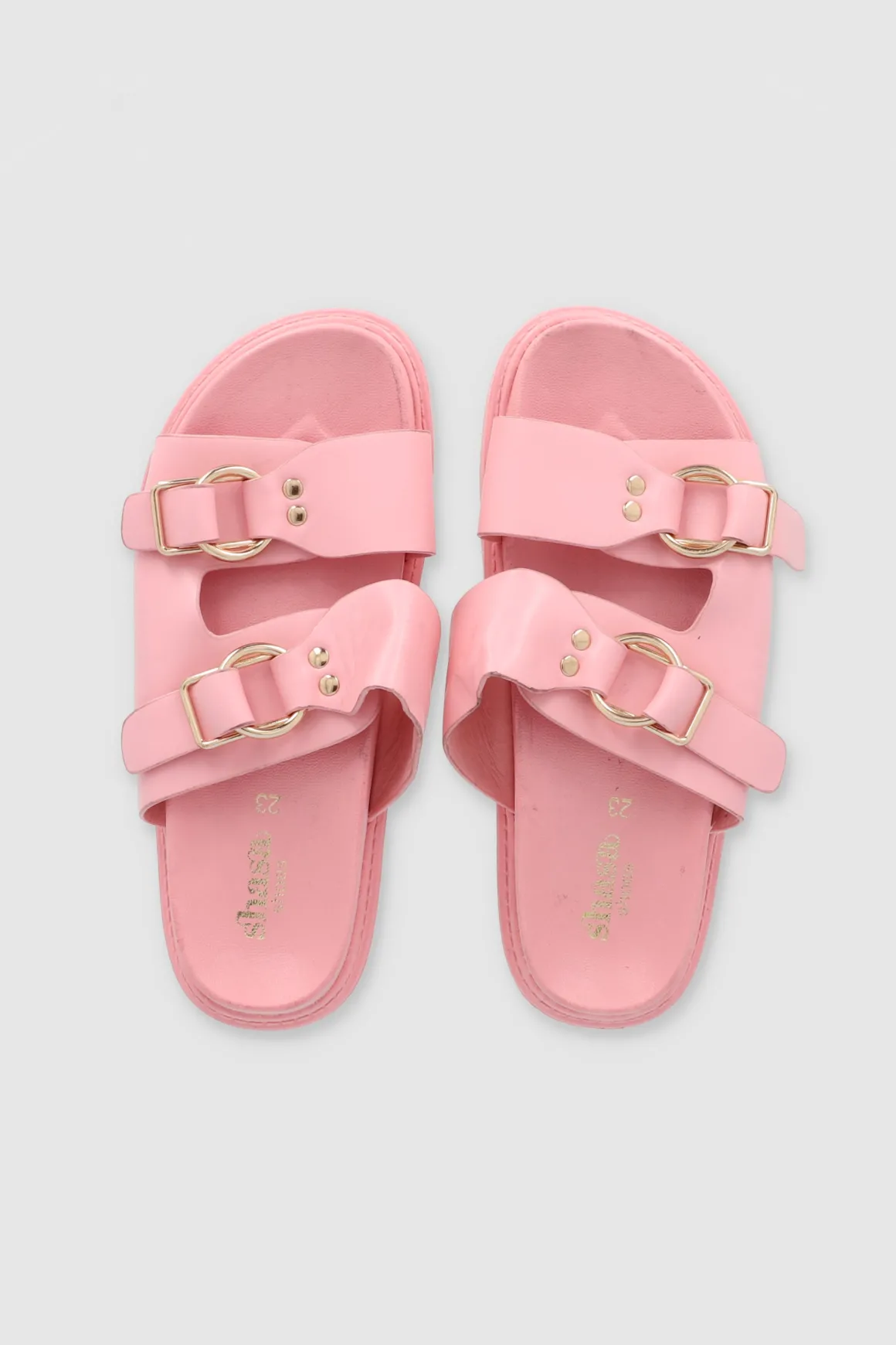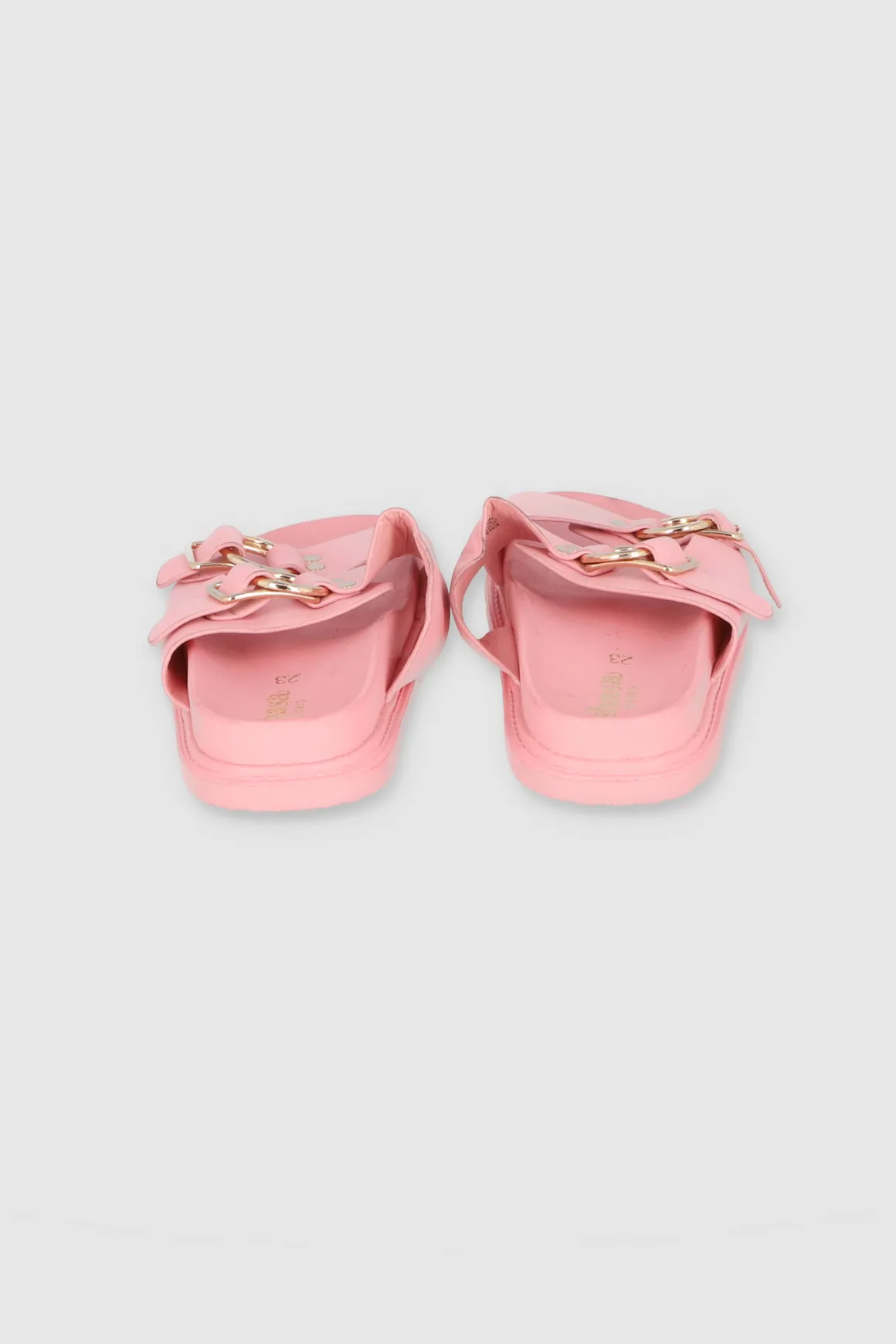 Sandalia plana con plataforma. Tiras unidas con hebilla circular y estoperoles de punto.