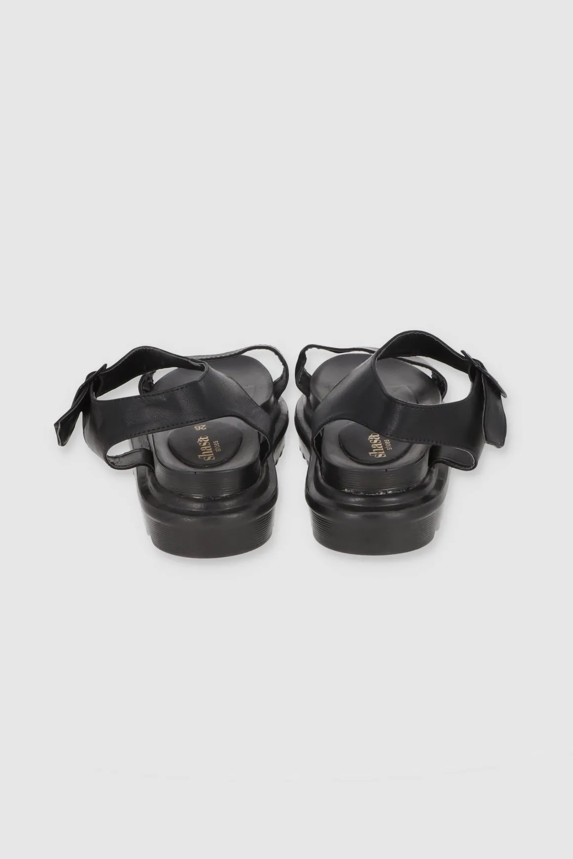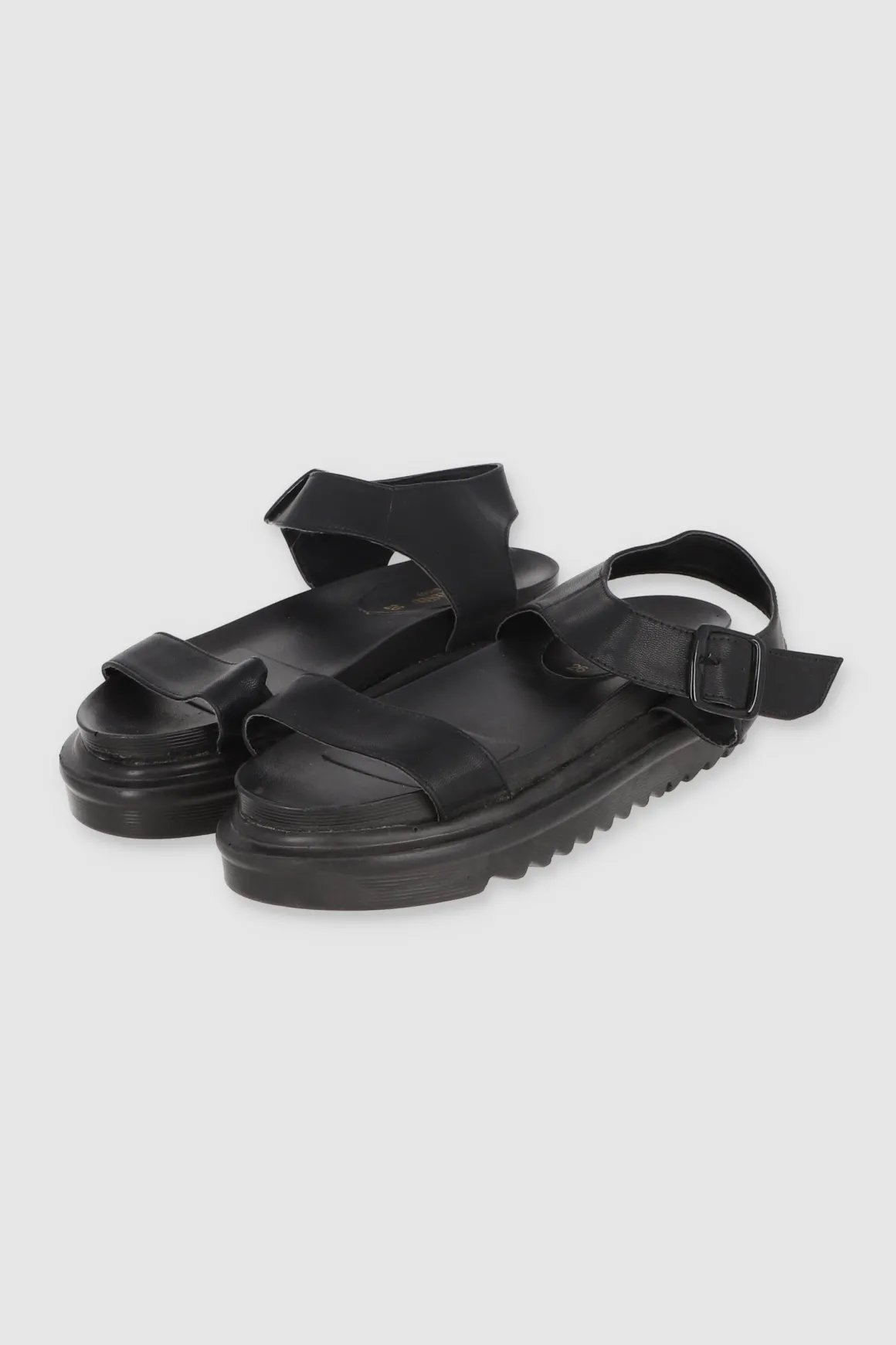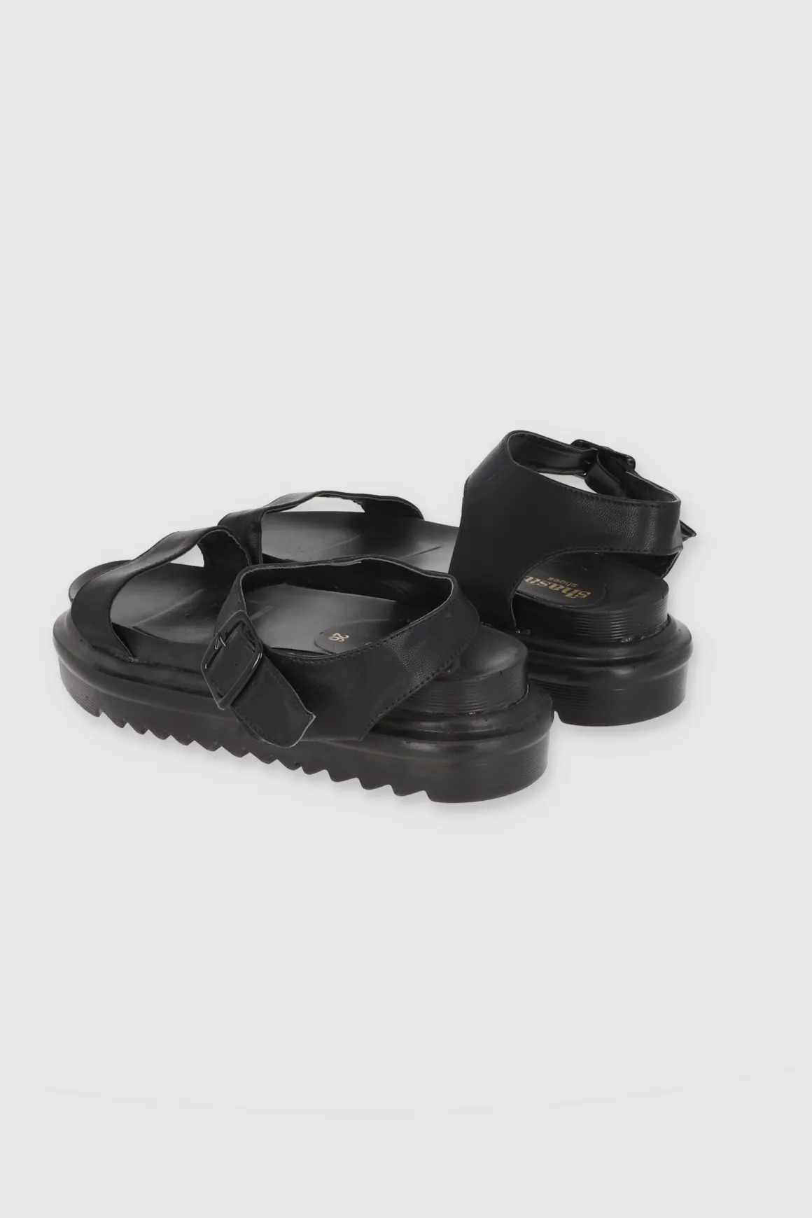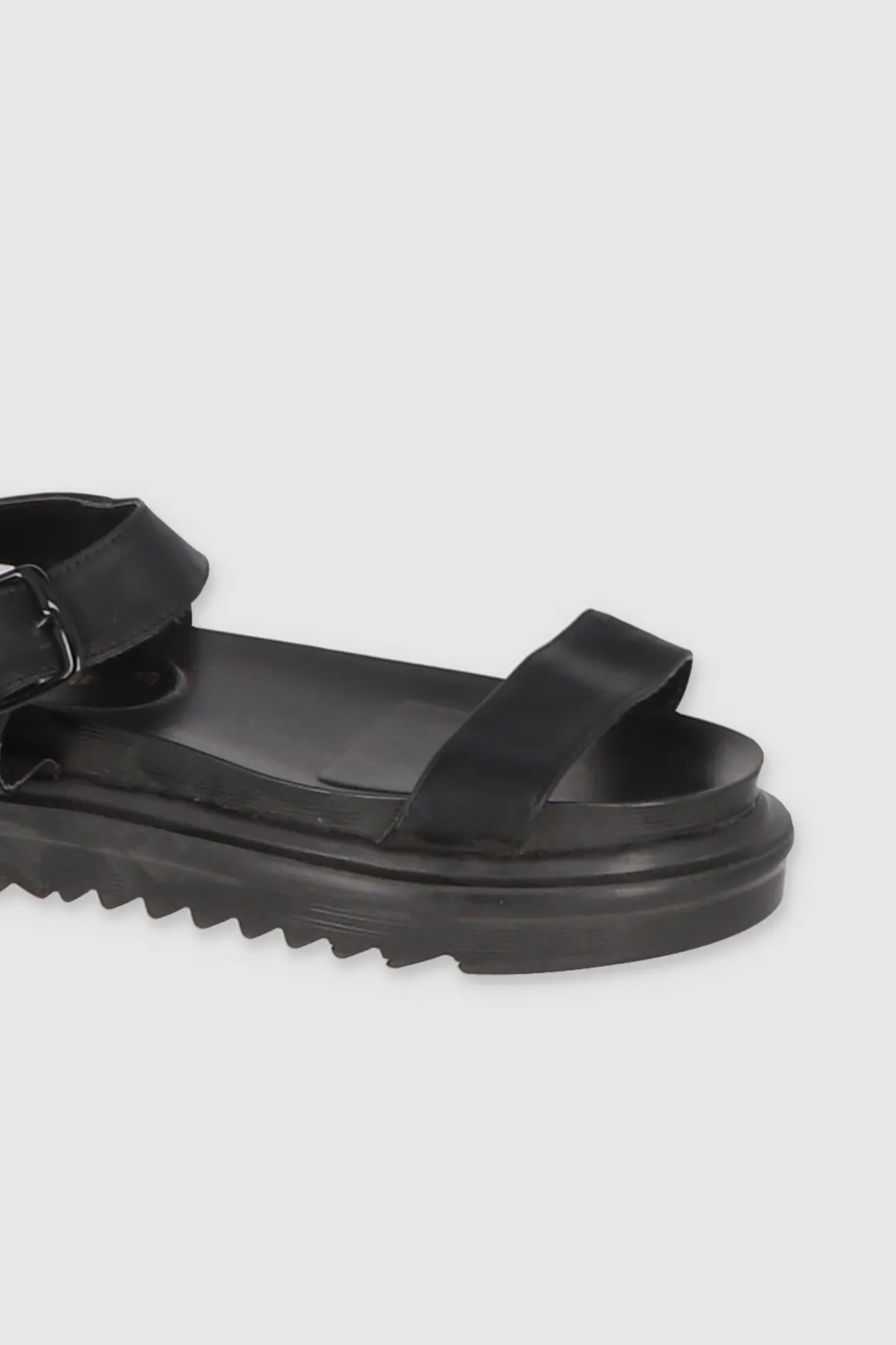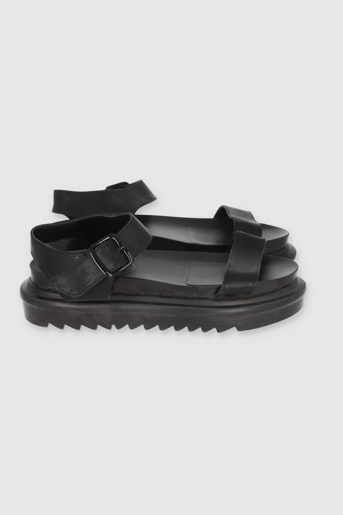 Sandalia plana con doble plataforma y suela track. Tira frontal efecto piel monocolor. Cierre mediante pulsera al tobillo.