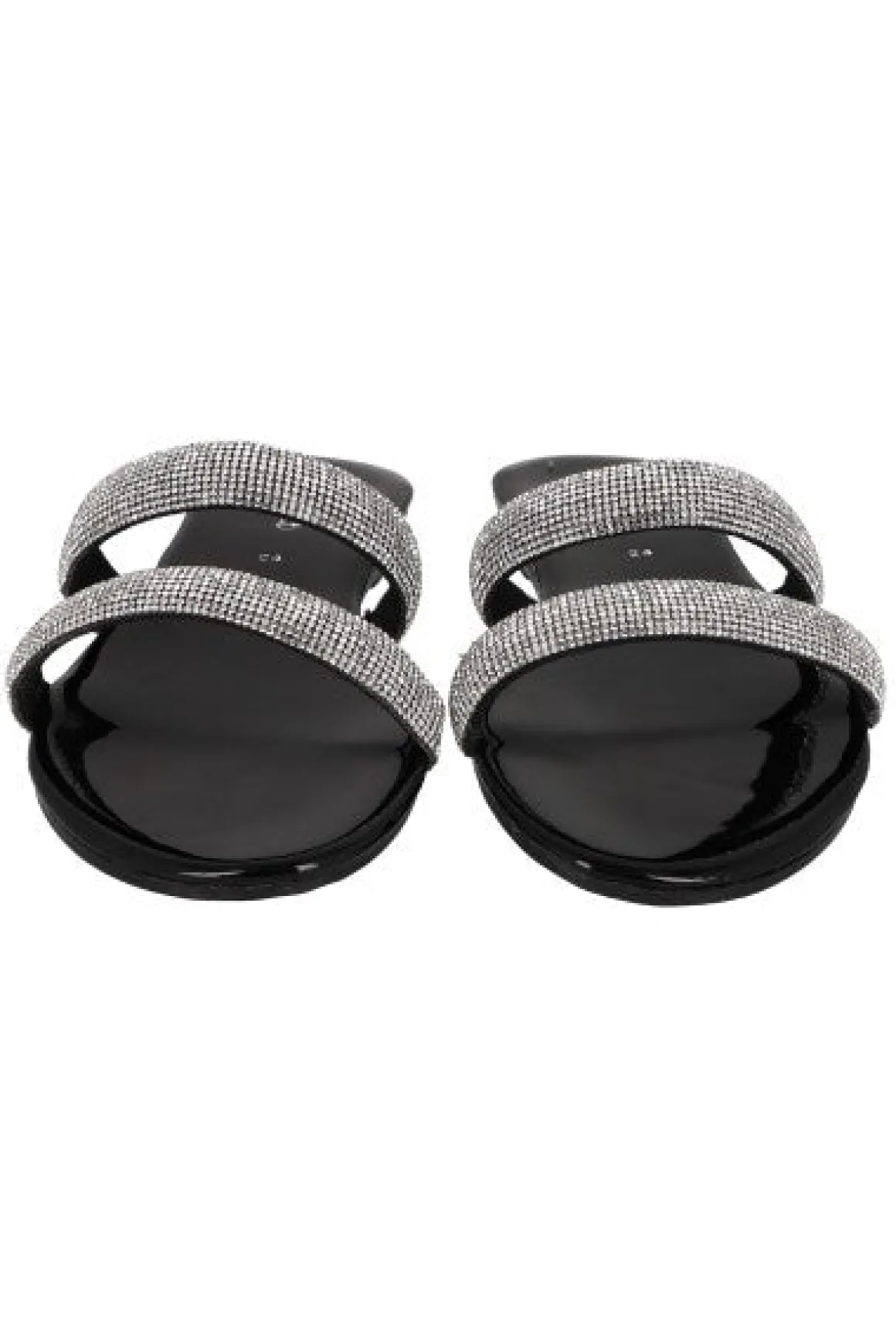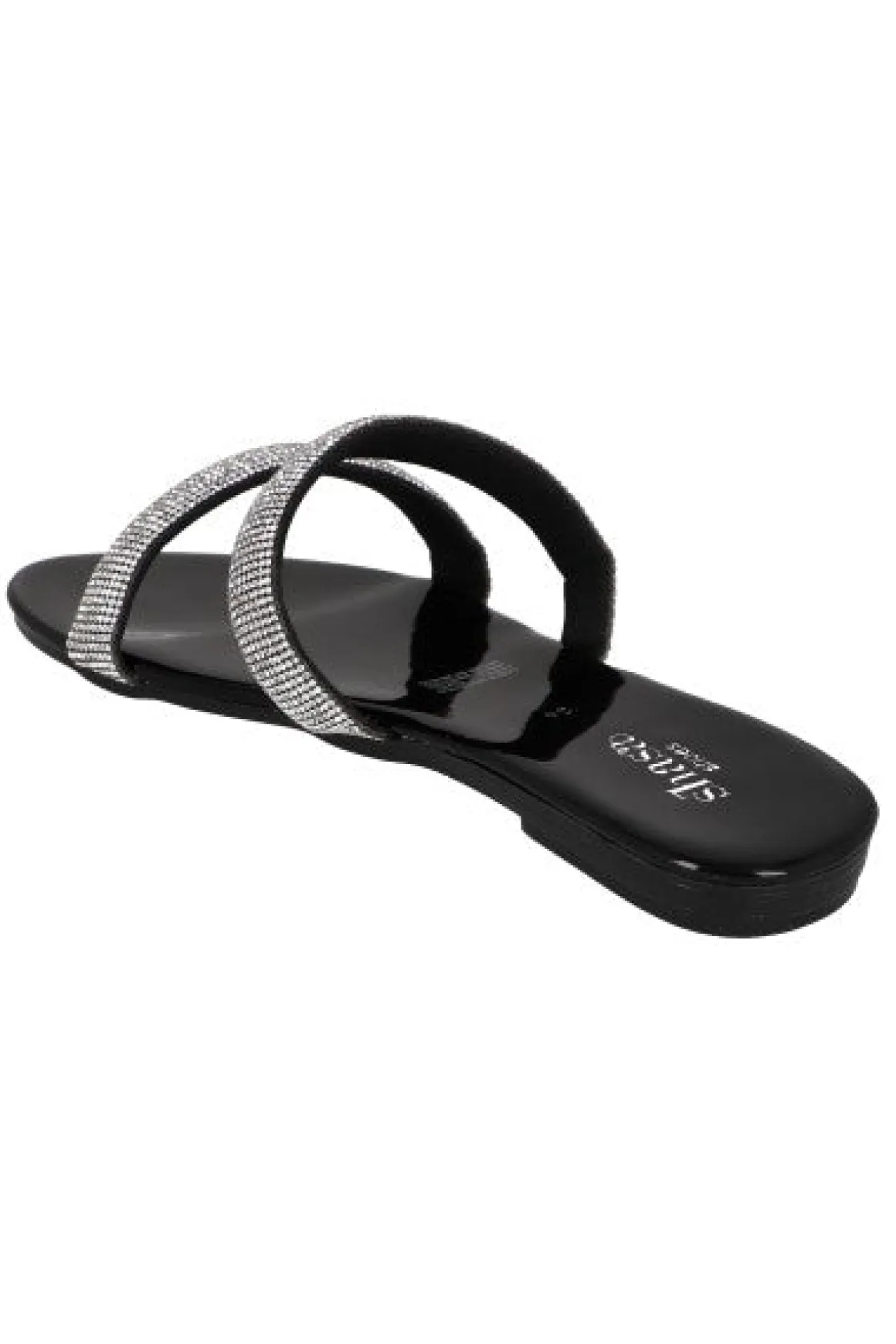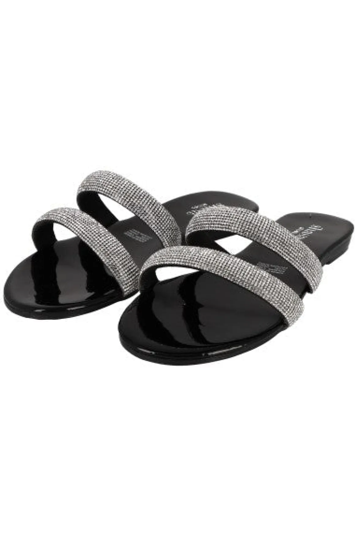 Sandalias pala con punta redonda y doble tira con aplicación de brillos.