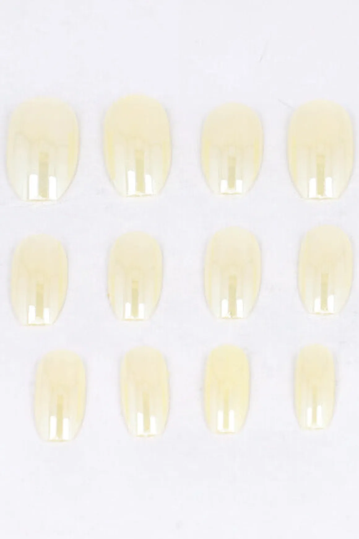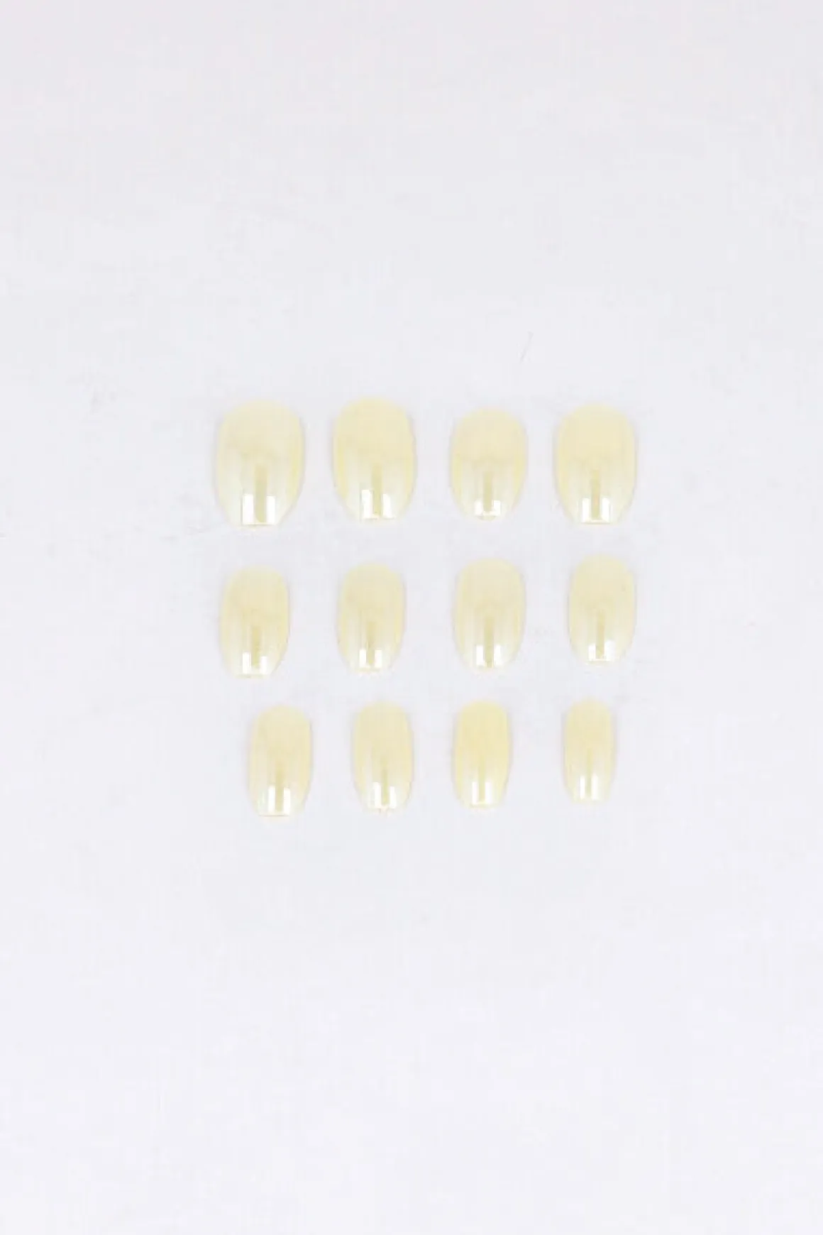 Set de 12 piezas de uñas postizas autoadhesivas. Punta redonda con efecto iridiscente.