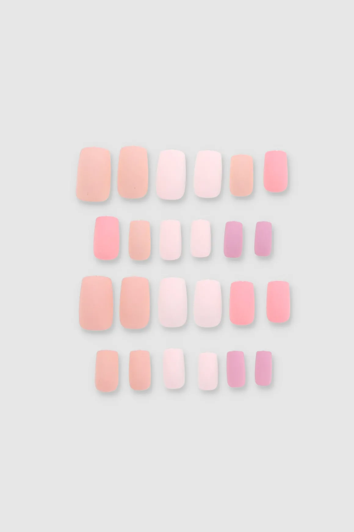 Set 24 piezas de uñas postizas autoadhesivas. Punta cuadrada con efecto mate. Multicolor.