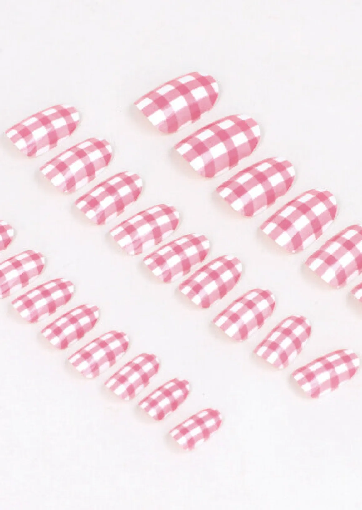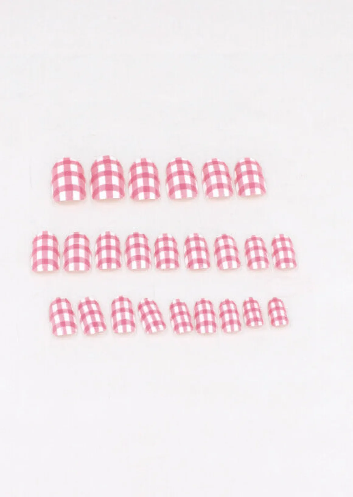 Set de 24 uñas postizas con diseño de cuadros y punta redondeada..