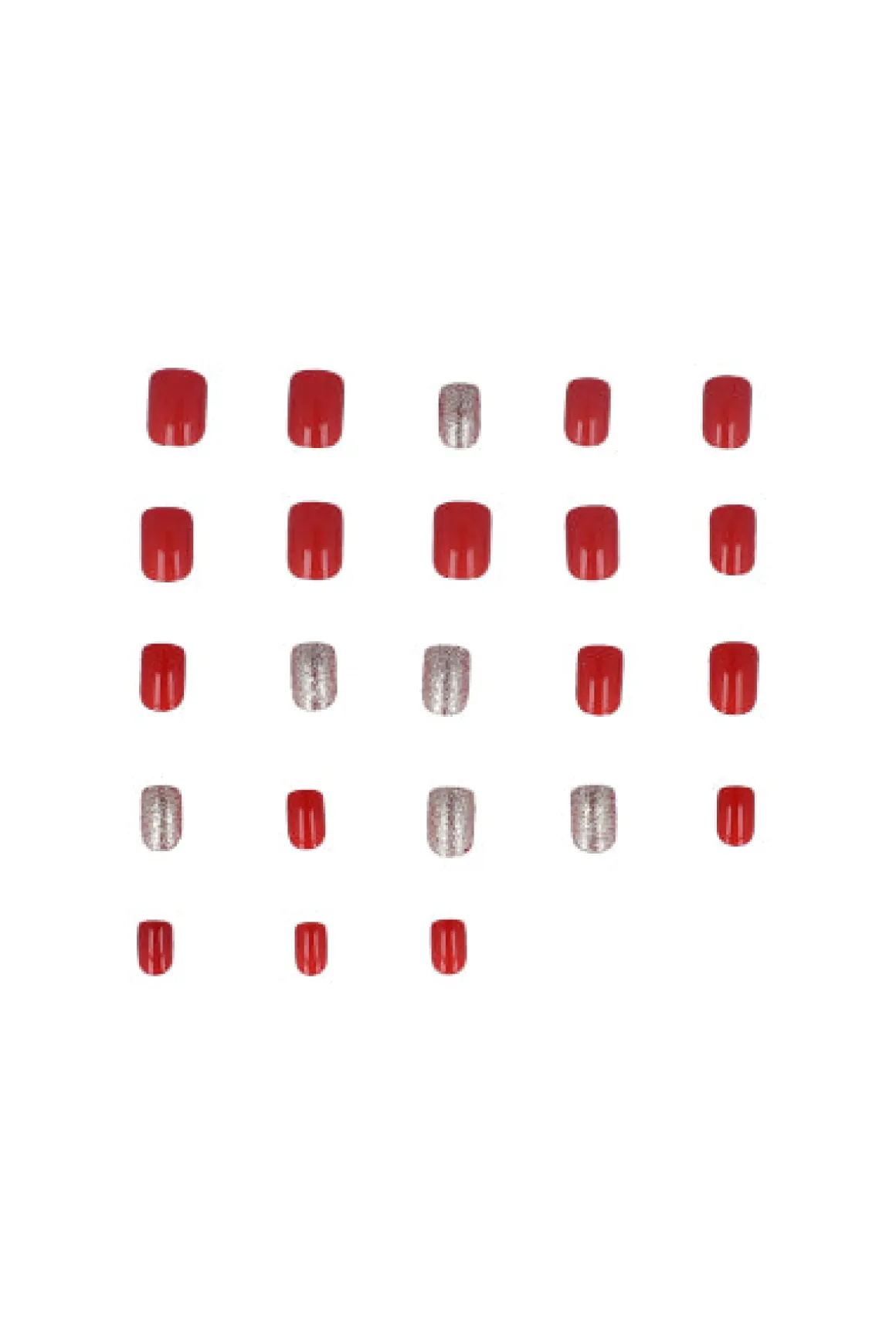 Set de 24 uñas postizas punta redonda con glitter. Efecto brilloso.