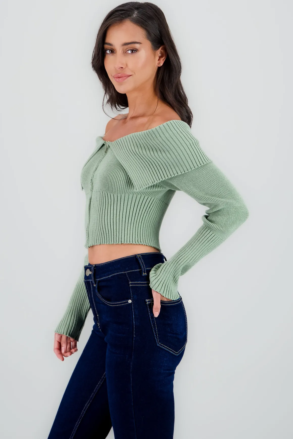 Este suéter off shoulder combina estilo y modernidad con un toque de estilo único. Diseñado para ser llevado con los hombros descubiertos, cuenta con un cierre metálico frontal que añade un detalle distintivo y chic.
