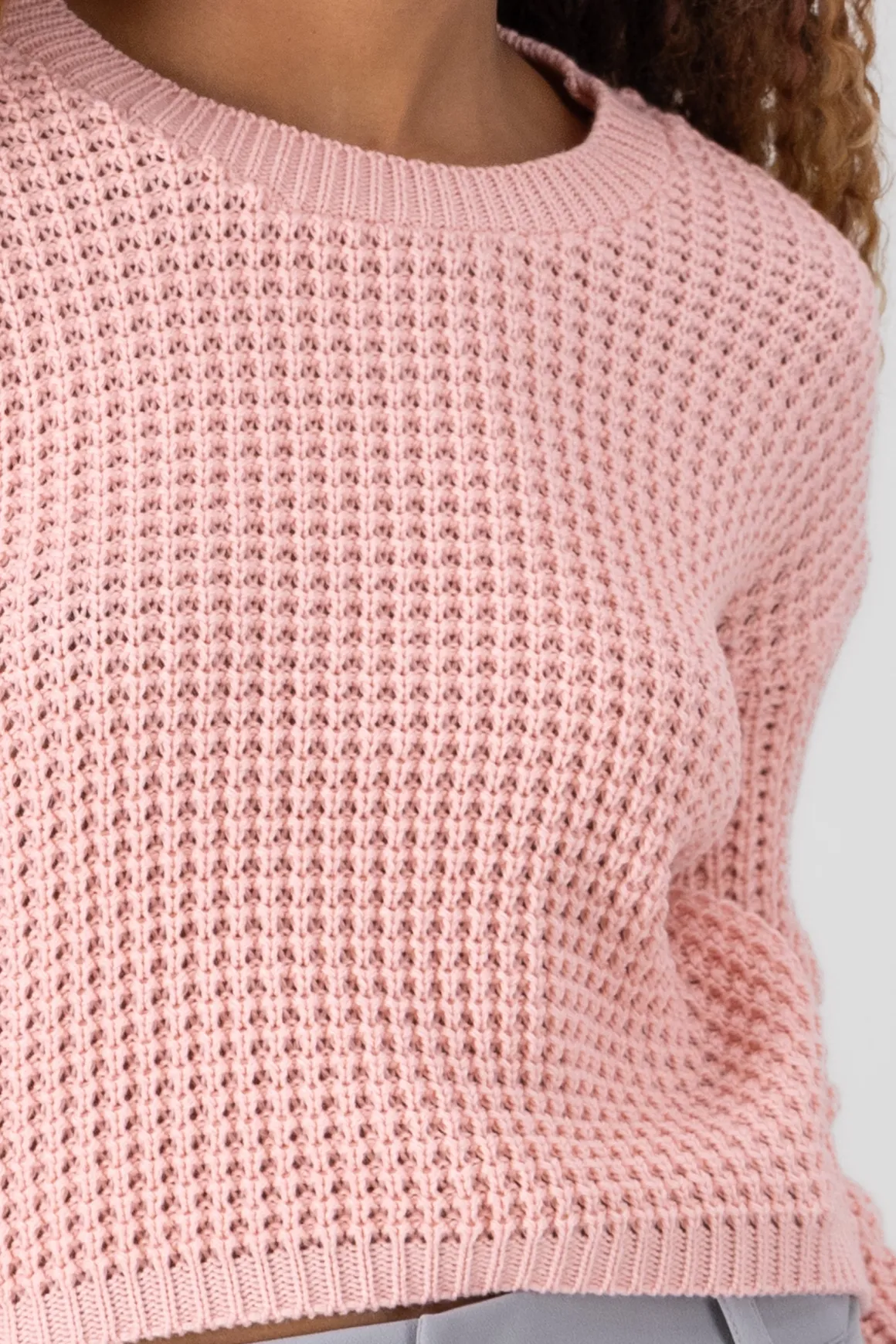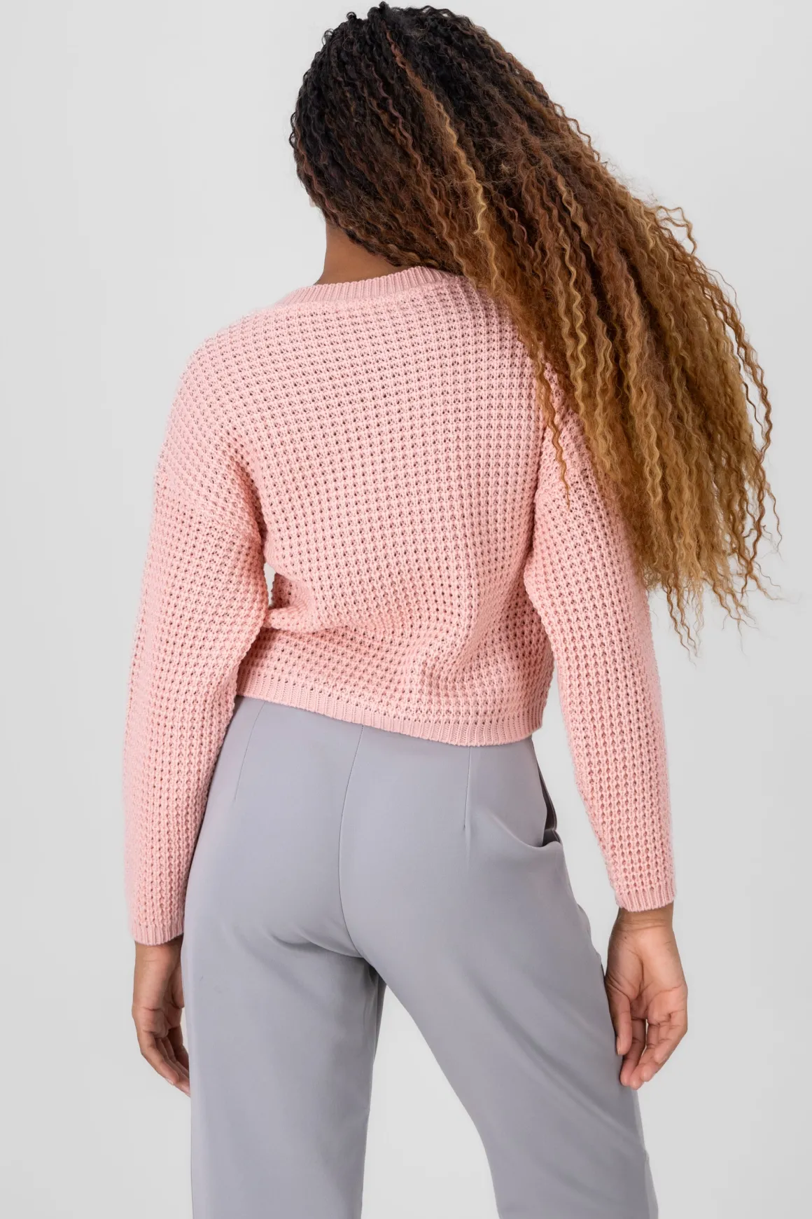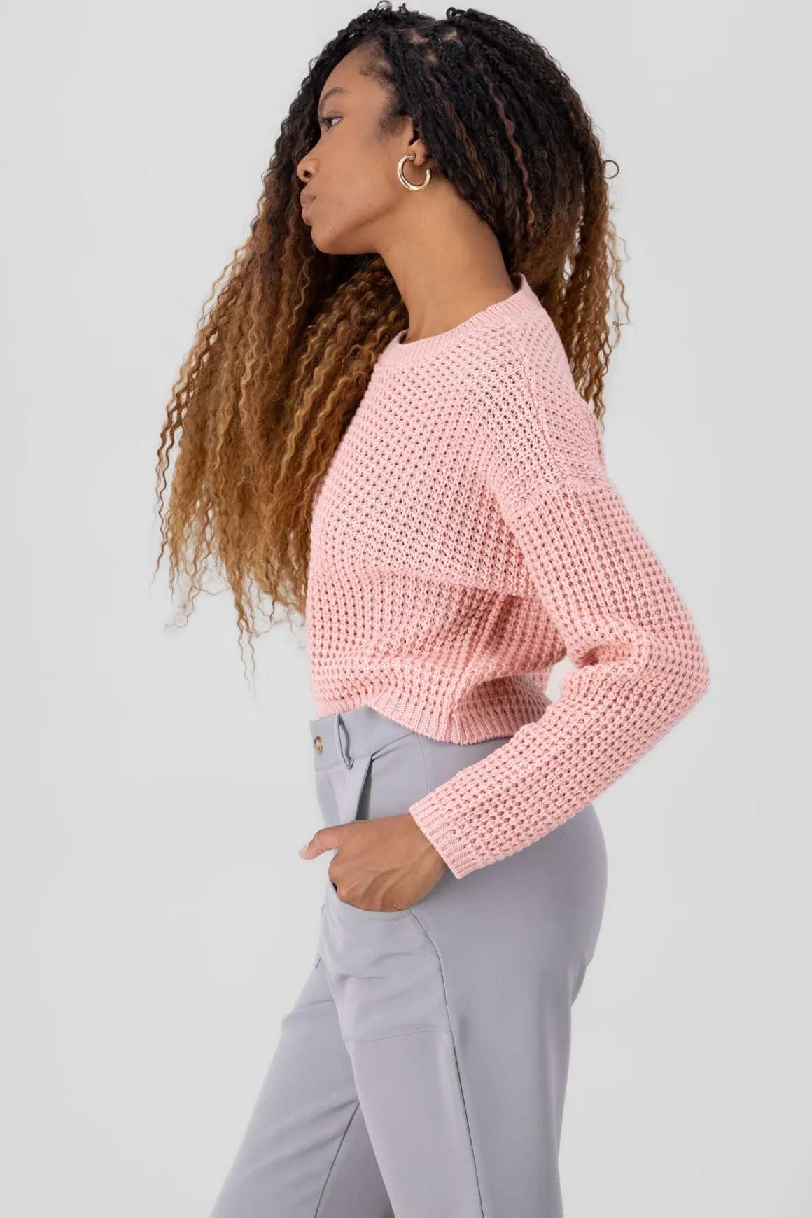 Dale un toque moderno a tu look con este suéter tejido cropped. Diseñado con un cuello redondo y hombros caídos, este suéter es perfecto para un estilo casual y contemporáneo.