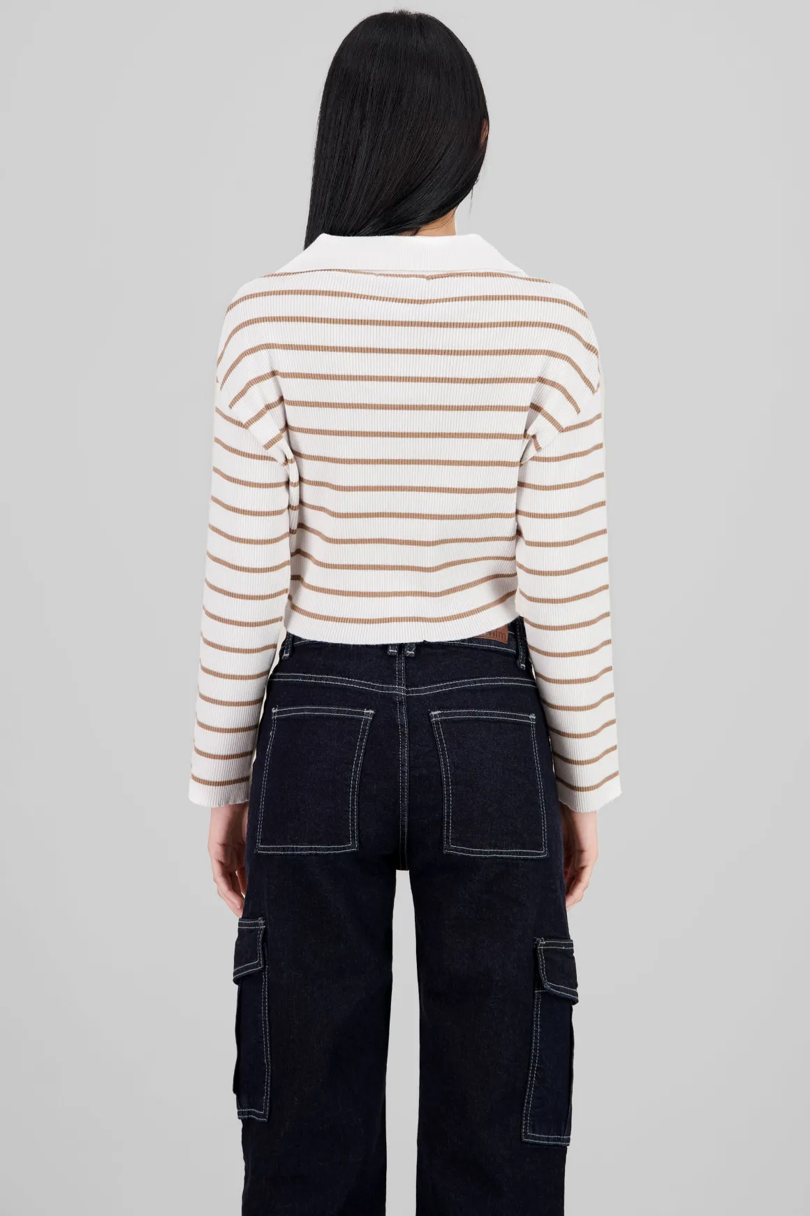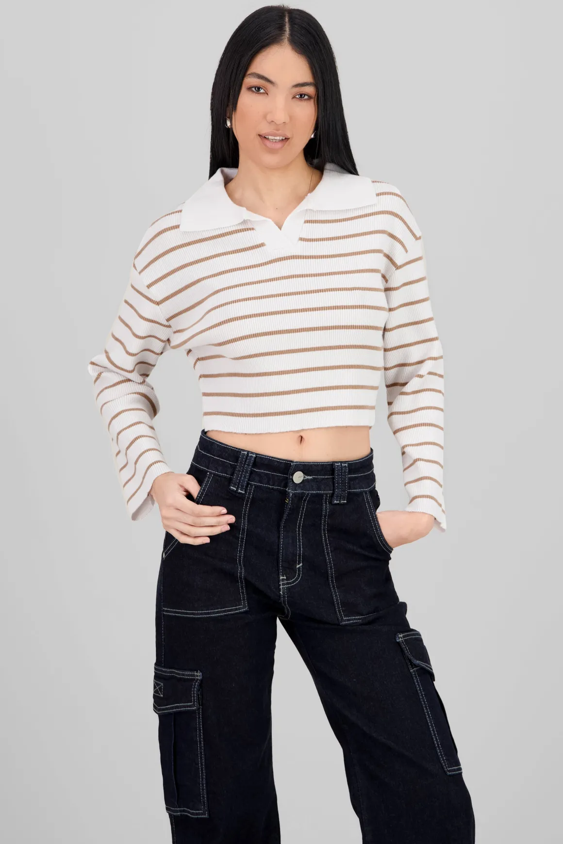 ¡Este suéter es lo que necesitas para darle un toque único a tu look! Con su cuello polo y el estampado de rayas, es perfecto para esos días frescos en los que buscas algo cómodo, pero con mucho estilo. Ideal para combinar con jeans o faldas, ¡te encantará!