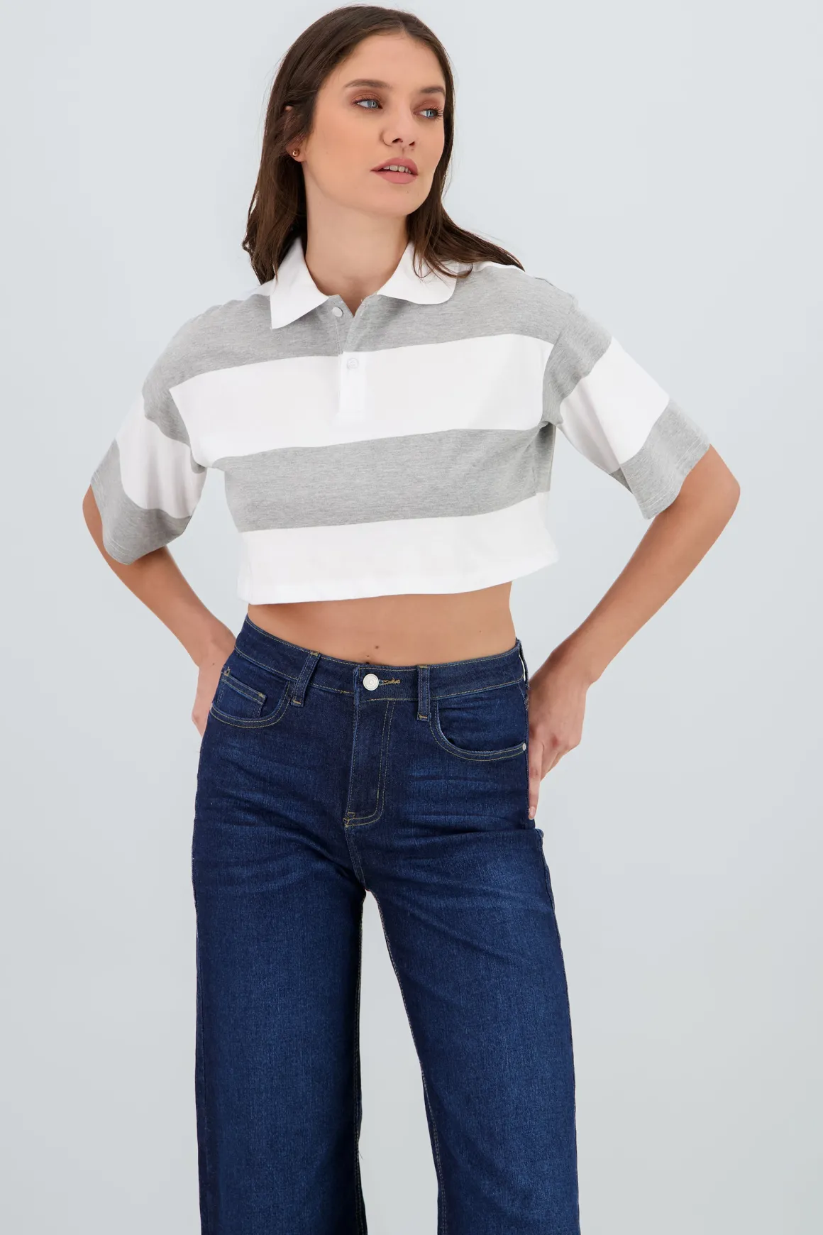 T-shirt crop cuello polo detalle rayas