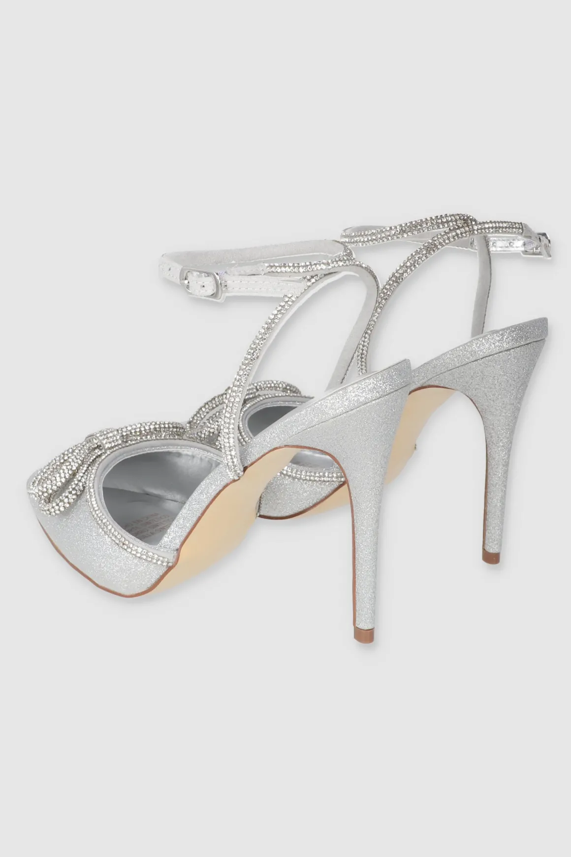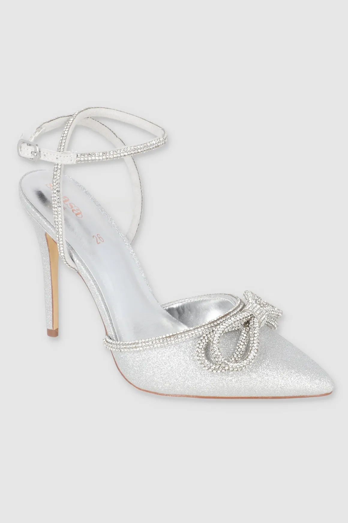 Tus pasos brillarán con estos tacones de aguja con un encantador moño y tiras cruzadas de brillos. Estos tacones son el complemento perfecto para tu look deslumbrante.