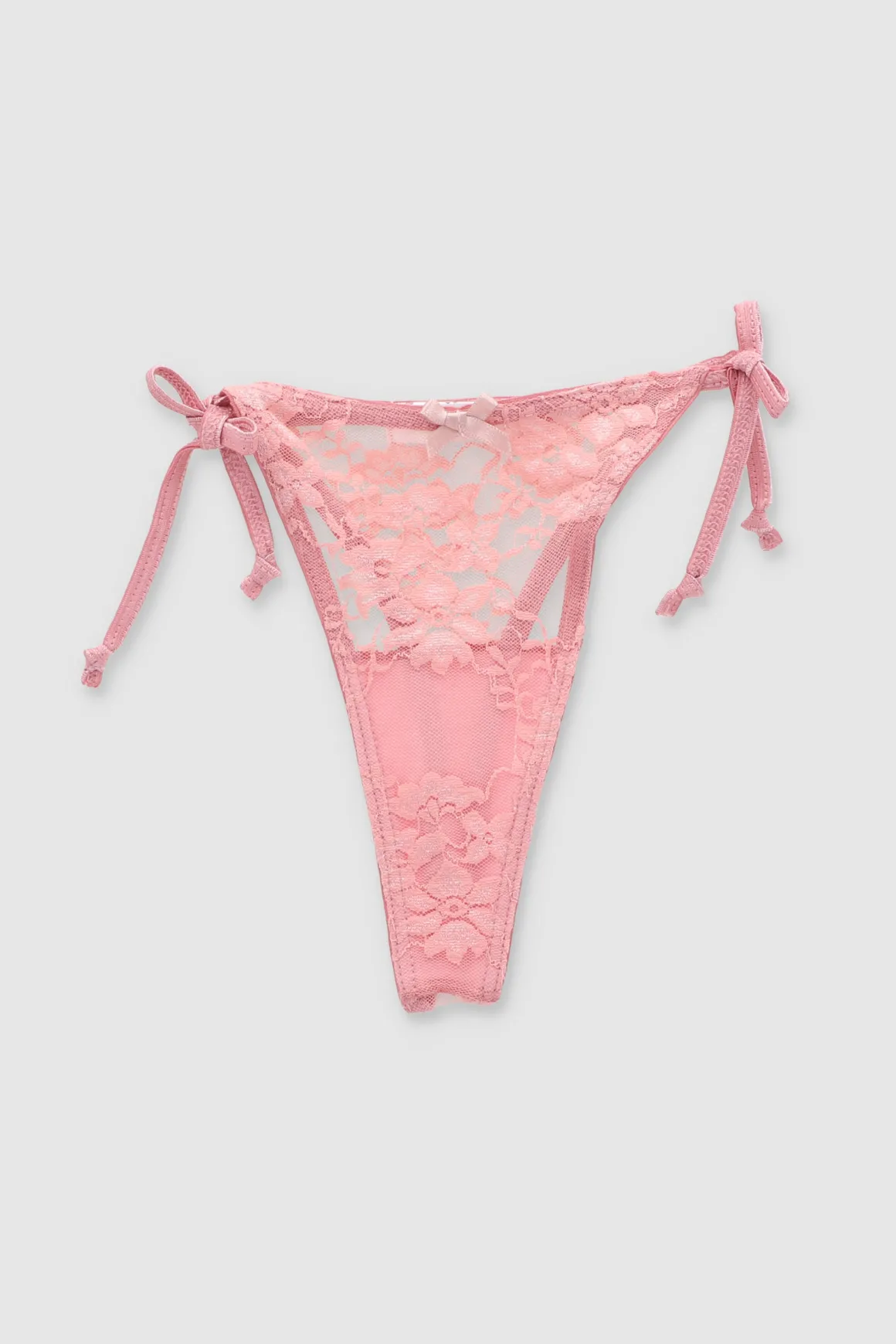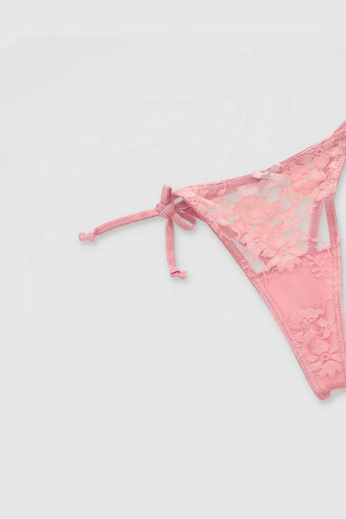 ¡Dale un toque coqueto a tu look! Esta tanga con moños y encaje es perfecta para mostrar tu lado más divertido. Ideal para cualquier ocasión.