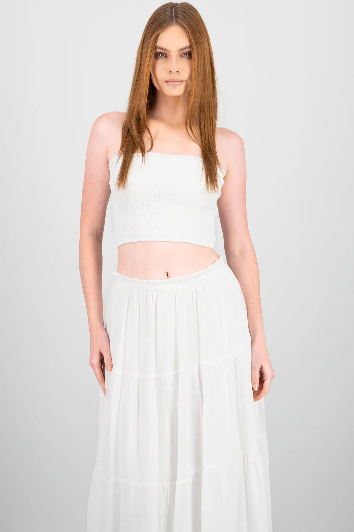 ¡Atrévete a elevar tu estilo con este top! Ideal para esas ocasiones donde quieres lucir divertida y chic, este top bandeau smocked es el toque perfecto para tu outfit.