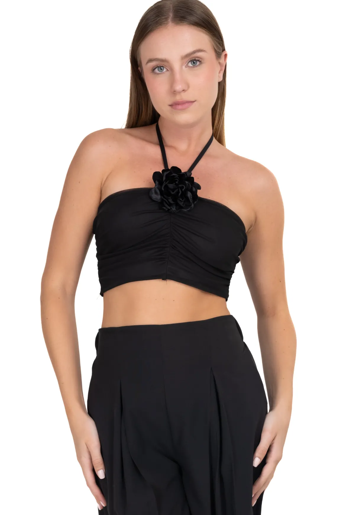 Top crop halter de tirantes delgados con amarre trasero, fruncido en busto con aplicación de flor.