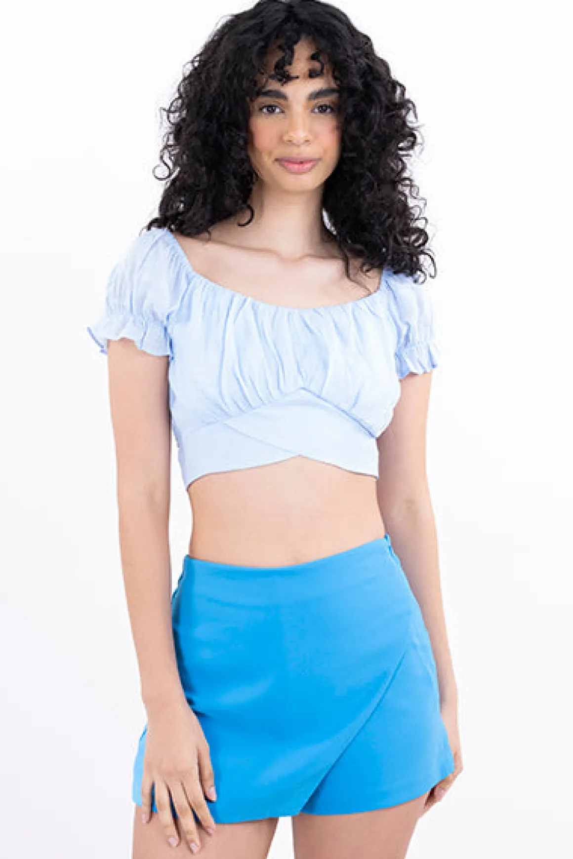 Top crop liso de escote cuadrado con busto fruncido y manga corta abullonada con olanes. Cinta cruzada en abdomen con cierre en espalda.