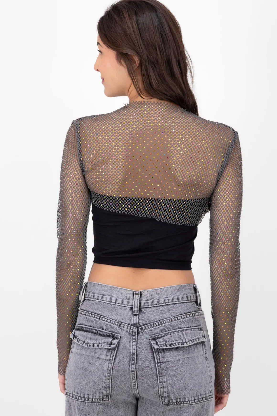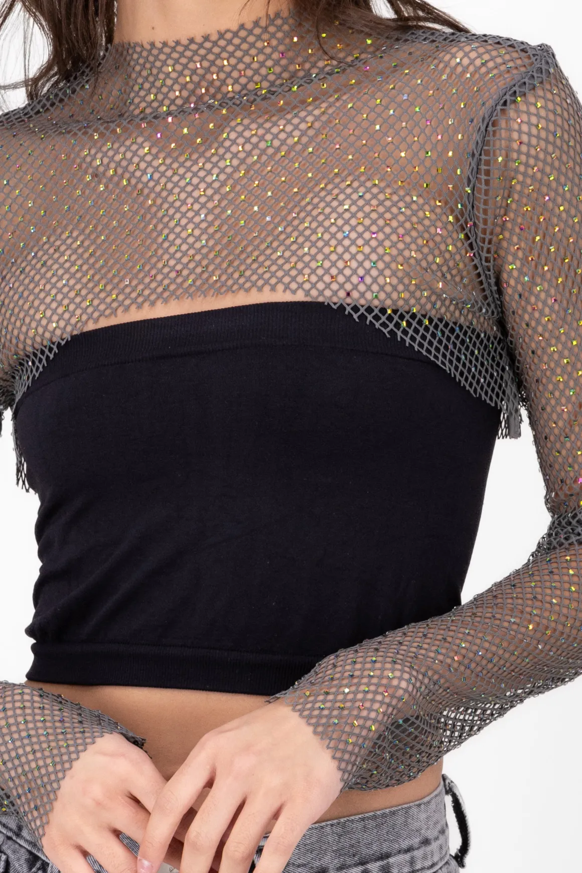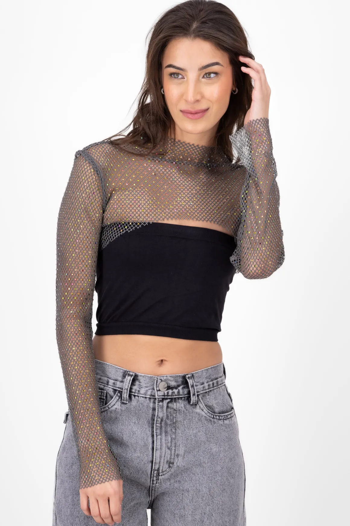 No te pierdas la oportunidad de destacar con este top crop de red y añadir un toque de brillo a tu vestuario.