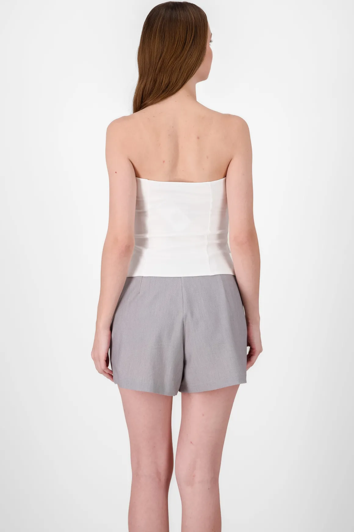 Este top strapless es perfecto para ocasiones más formales, con detalles de botones y bolsillos al centro que le dan un aire estructurado. Combínalo con pantalones ajustados para un look elegante.