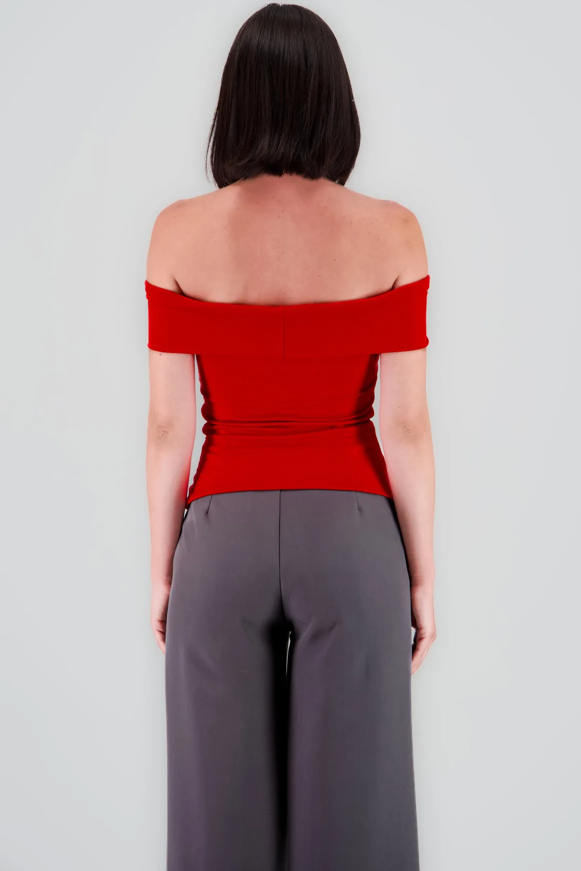 Top liso con diseño off shoulder, corte asimétrico y detalle en la parte central.