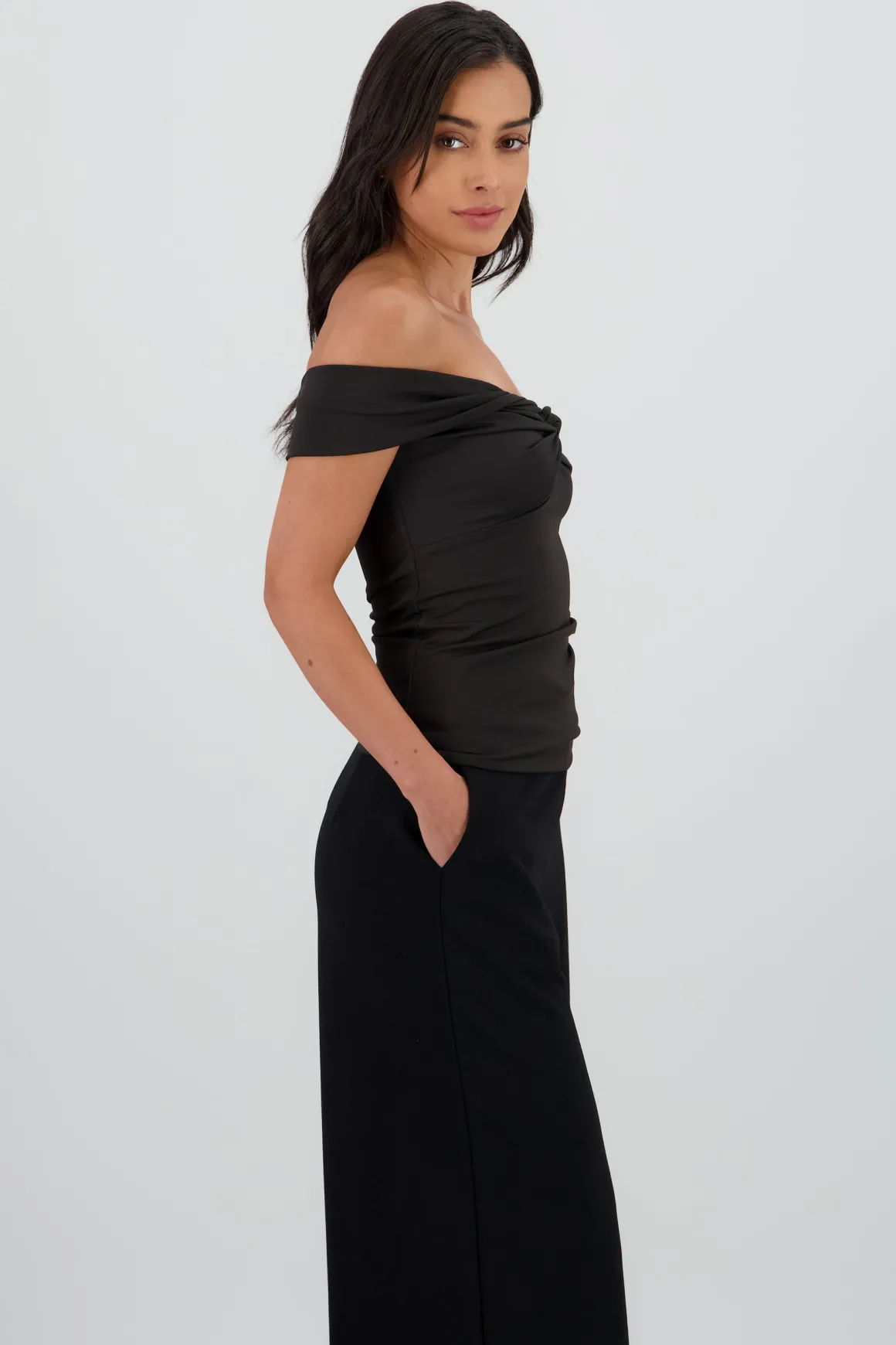 Top liso con diseño off shoulder, corte asimétrico y detalle en la parte central.