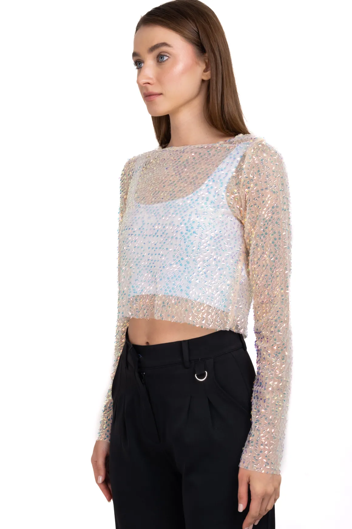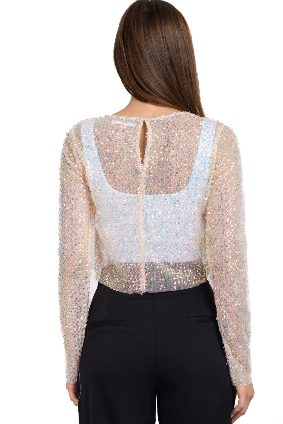 Top de manga larga con cuello redondo y aplicación de lentejuelas iridiscentes.