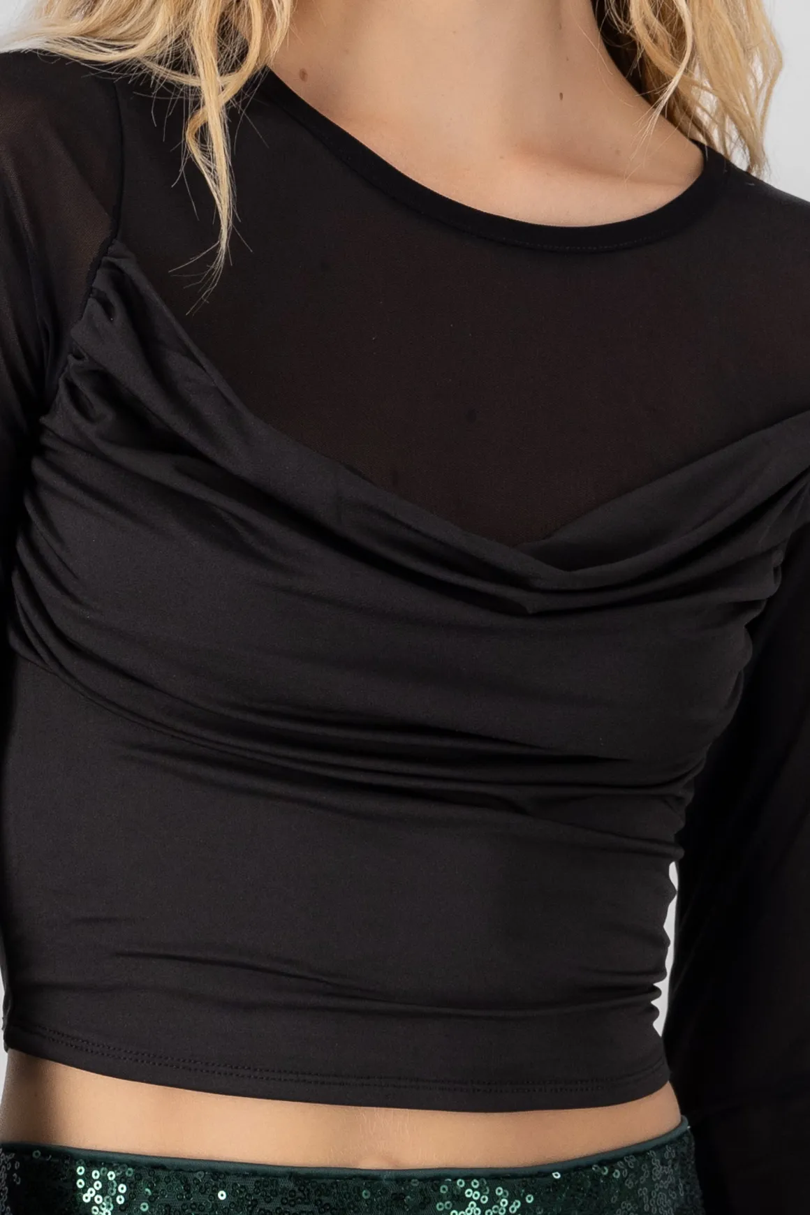Este top mesh drapeado es perfecto para un look chic y moderno. Con su diseño liso y mangas largas, el efecto drapeado le añade un toque especial que no pasará desapercibido.