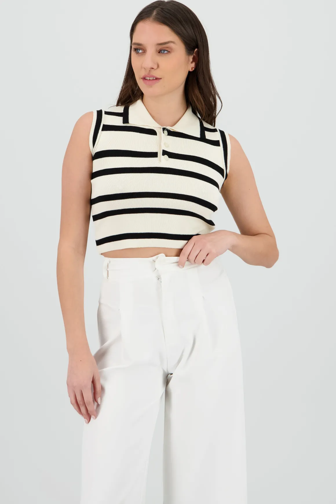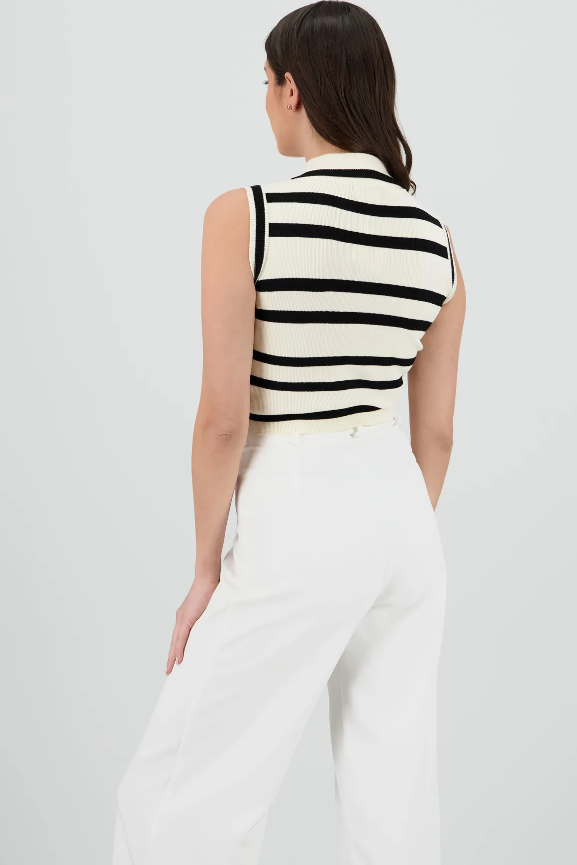 Top con diseño de rayas, cuello polo, tejido ligero y sin mangas. Detalles de corte clásico y versatilidad.