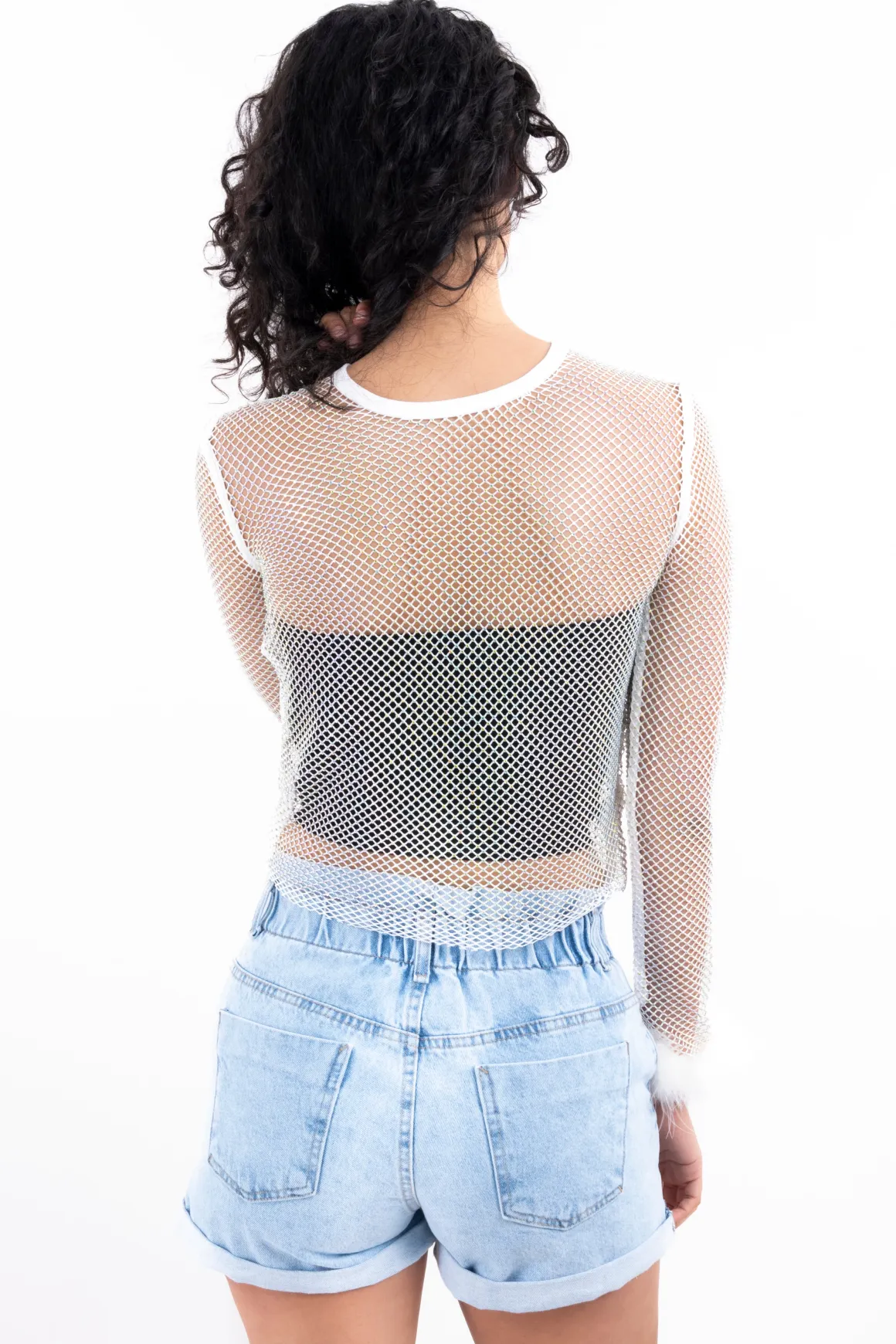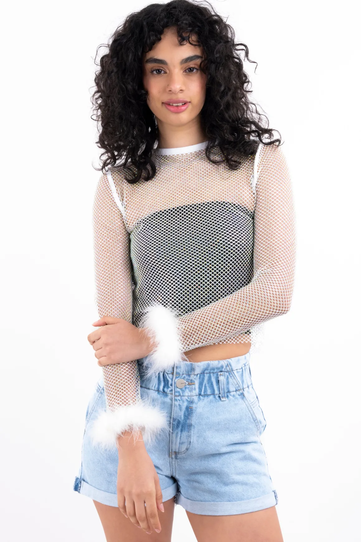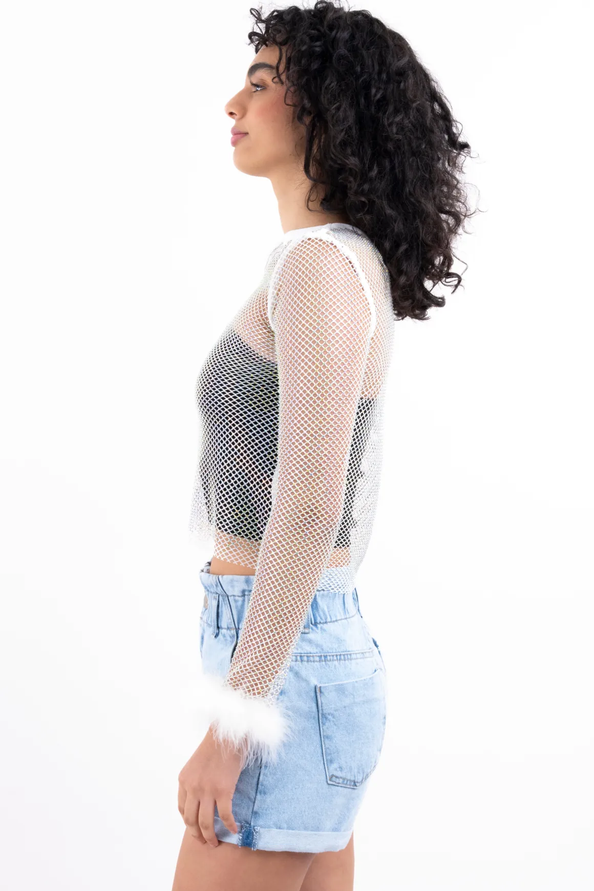 Top red de manga larga y cuello redondo, aplicación de multibrillos y plumas en mangas.