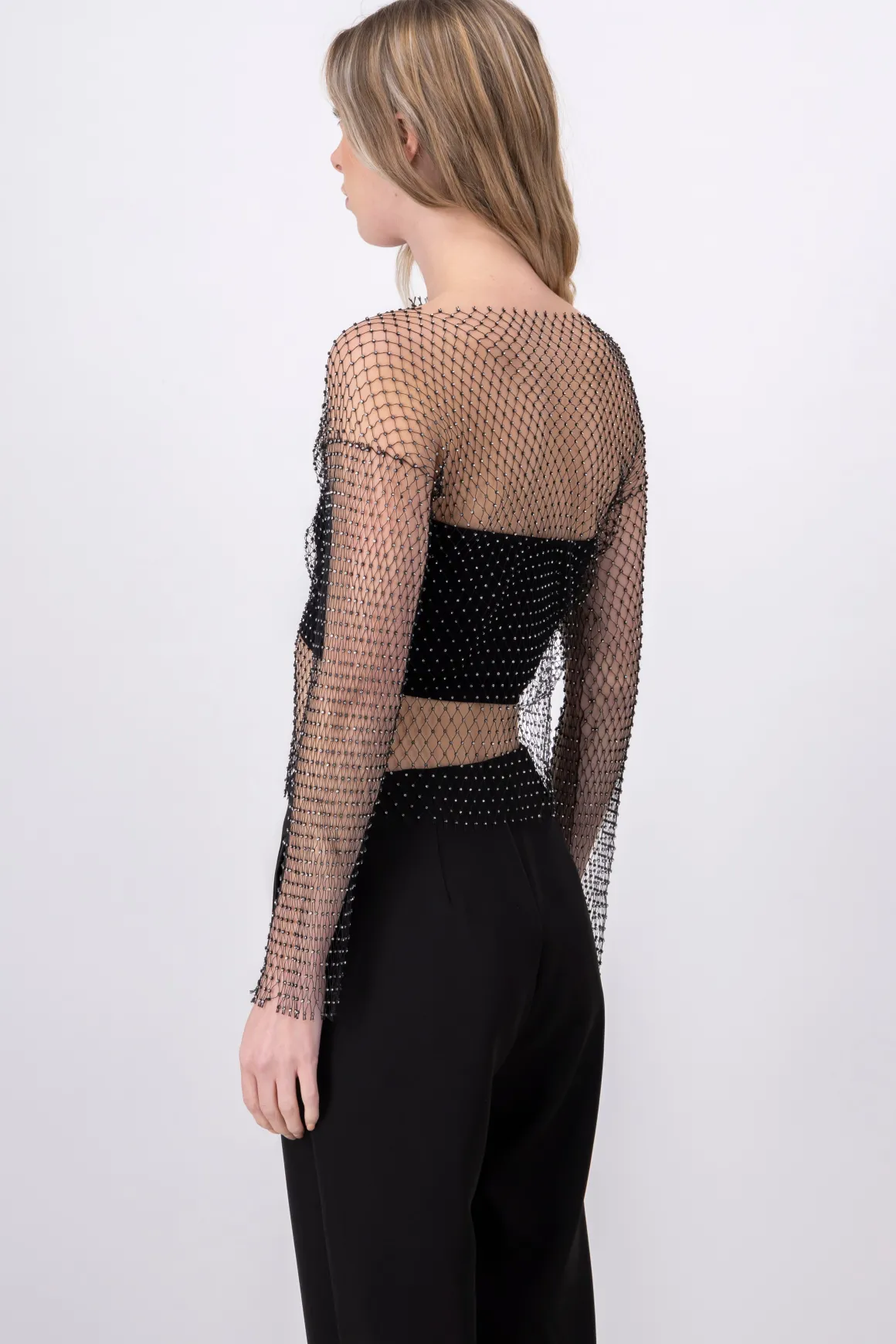 Este top de red es la combinación perfecta de estilo y comodidad. Con una aplicación de brillos sutil que agrega un toque de glamour, este top presenta un cuello redondo que favorece a cualquier figura. Los hombros caídos añaden un aire de sofisticación, mientras que las mangas largas con un ligero acampanado le dan un toque moderno y femenino a tu outfit.