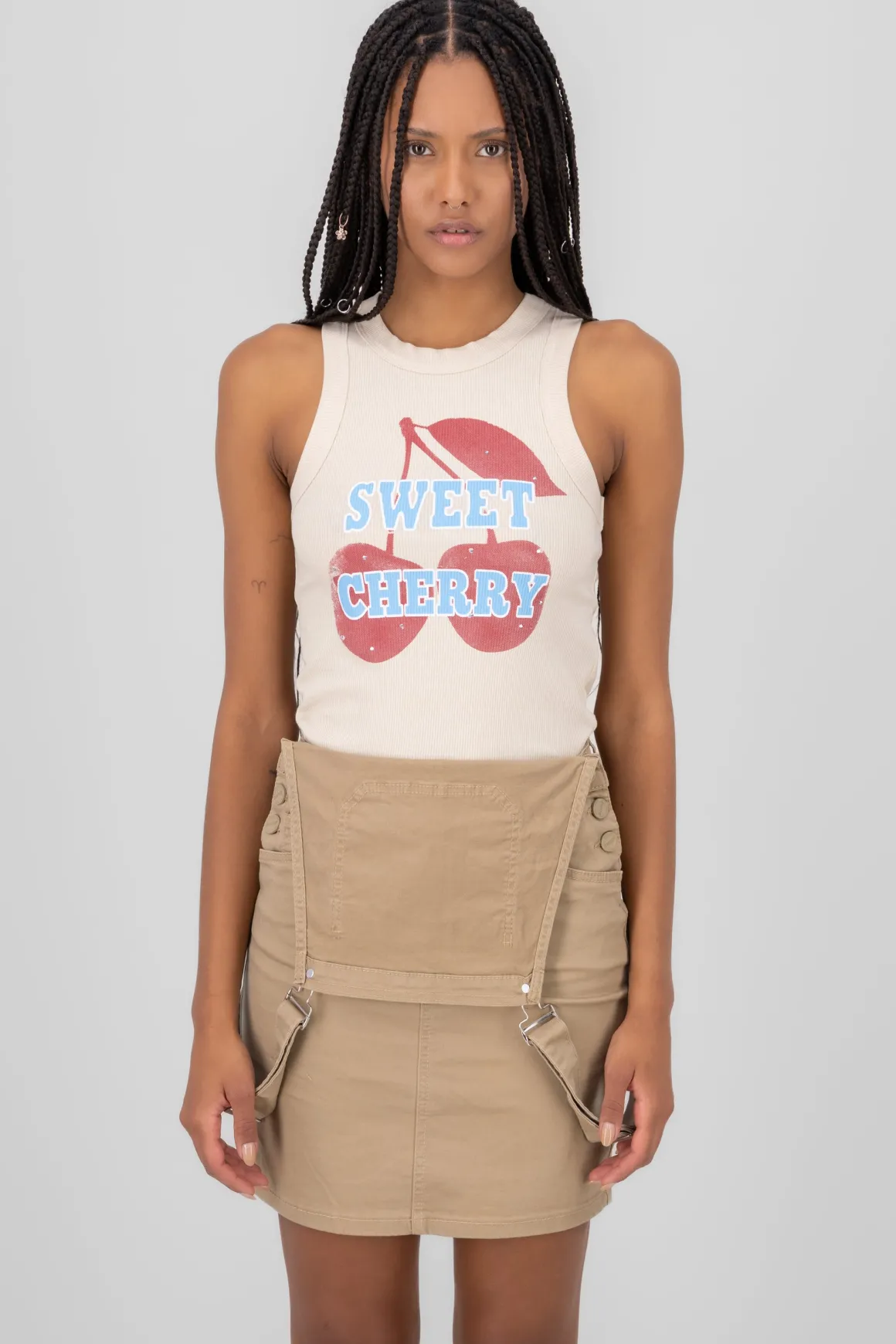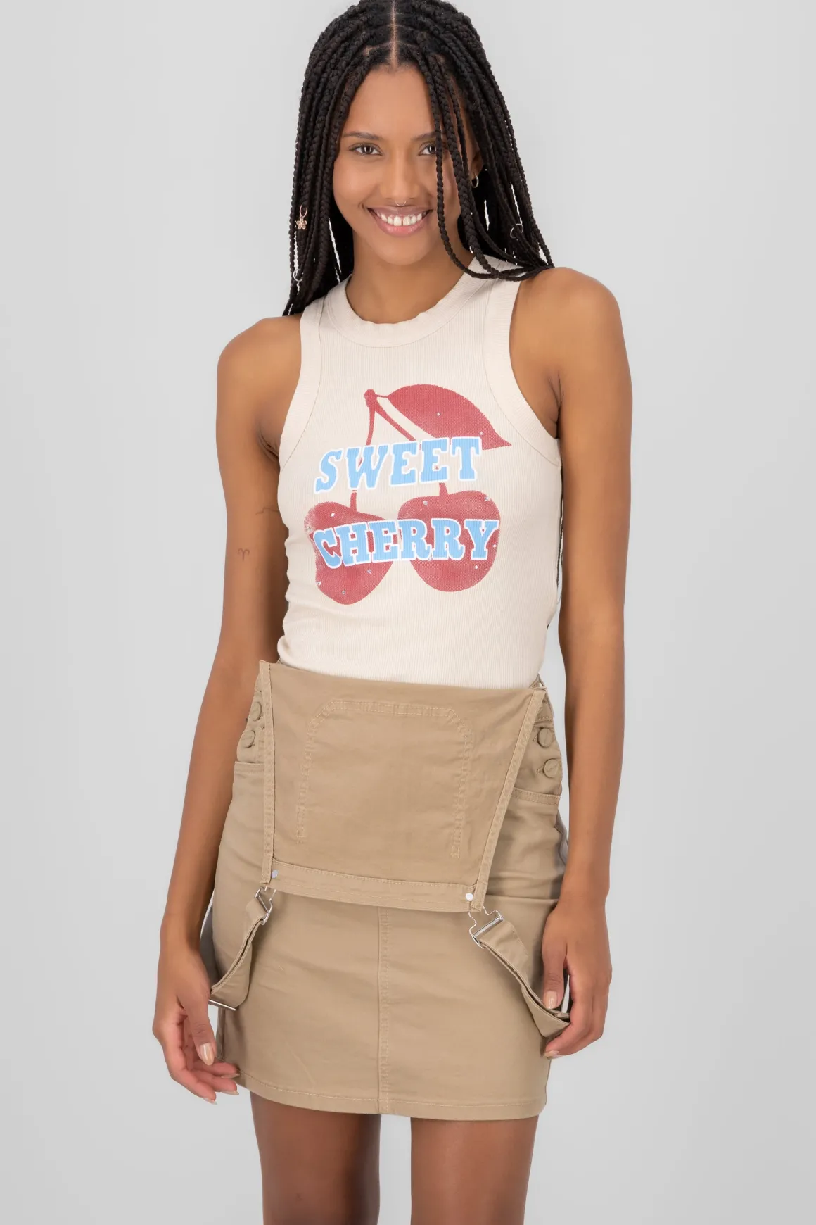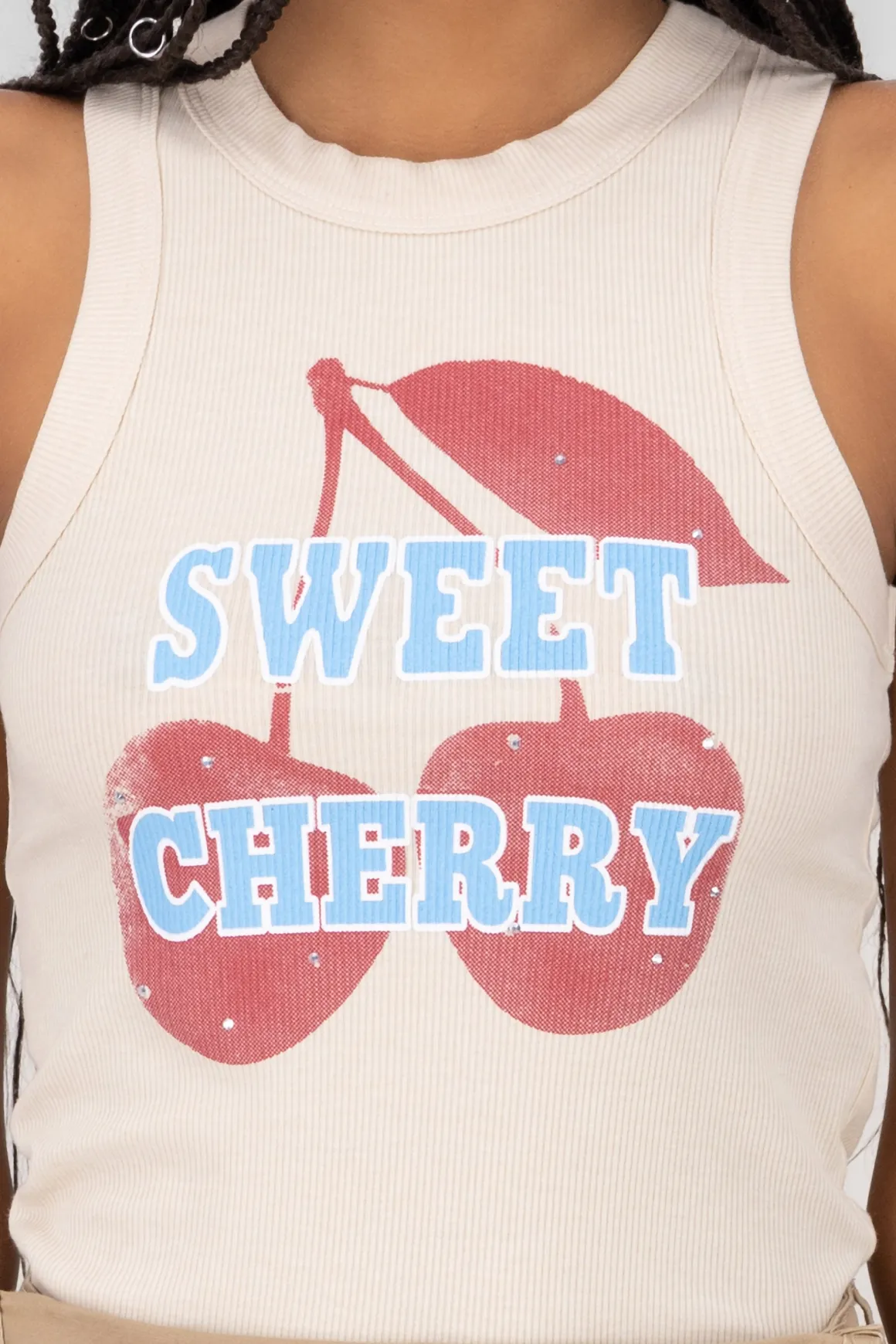 Este top acanalado sin mangas es una adición encantadora a tu armario. Con un diseño de cuello redondo y un estampado de cerezas, es perfecto para un look fresco y juvenil. La textura acanalada le da un toque interesante y moderno, ideal para combinar con shorts o faldas de verano. Es una prenda versátil que puedes usar tanto para una salida casual como para un día de relax. Añade un toque de diversión a tu estilo con este adorable top.
