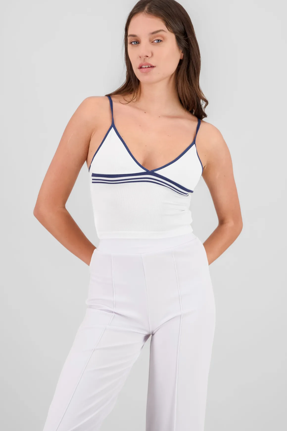 Este top es la elección perfecta para quienes buscan un toque especial en su guardarropa. Con un diseño que destaca por sus tirantes de contraste, cada detalle está pensado para aportar un estilo único.