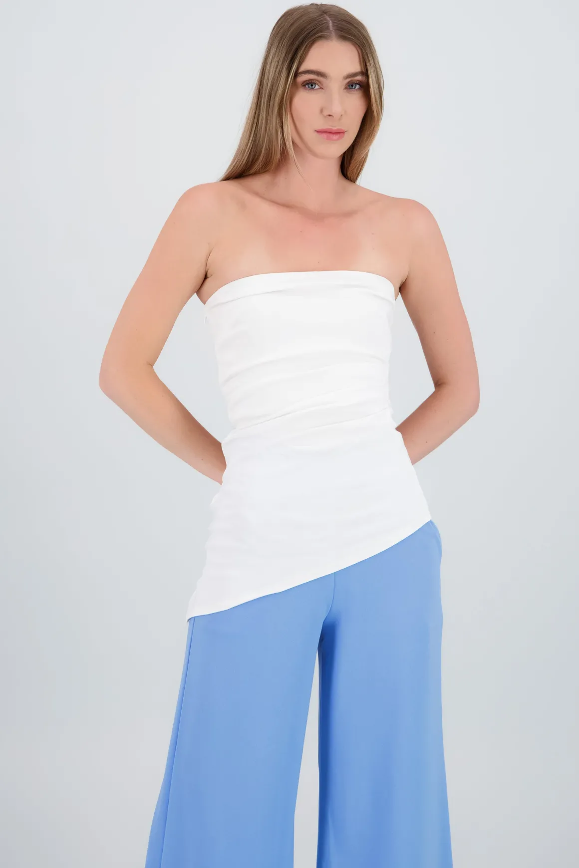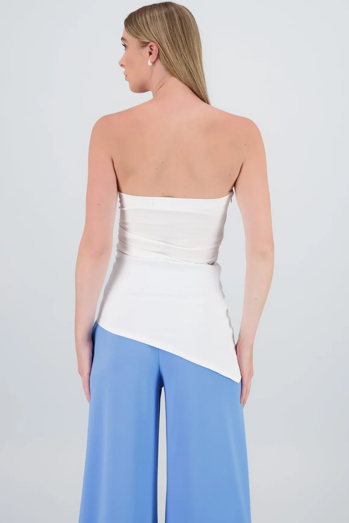 Top tubo con costado plisado, hombros descubiertos, ajuste ceñido.
