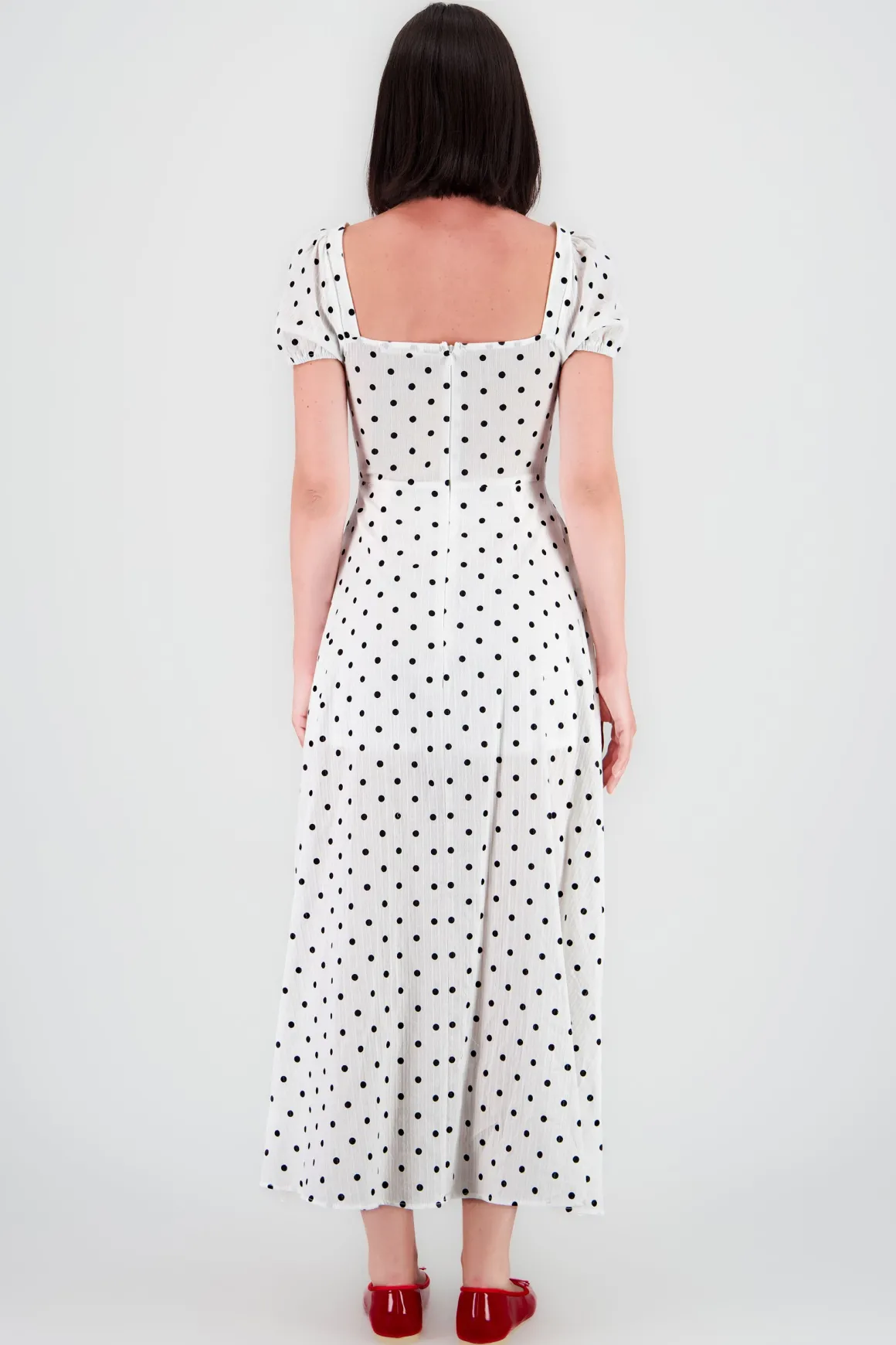 ¡Atrévete a destacar con un toque retro! Este vestido midi estampado polka es la elección perfecta para quienes buscan un estilo atemporal. Con su diseño encantador, cada detalle cuenta para hacer de tu outfit algo especial.