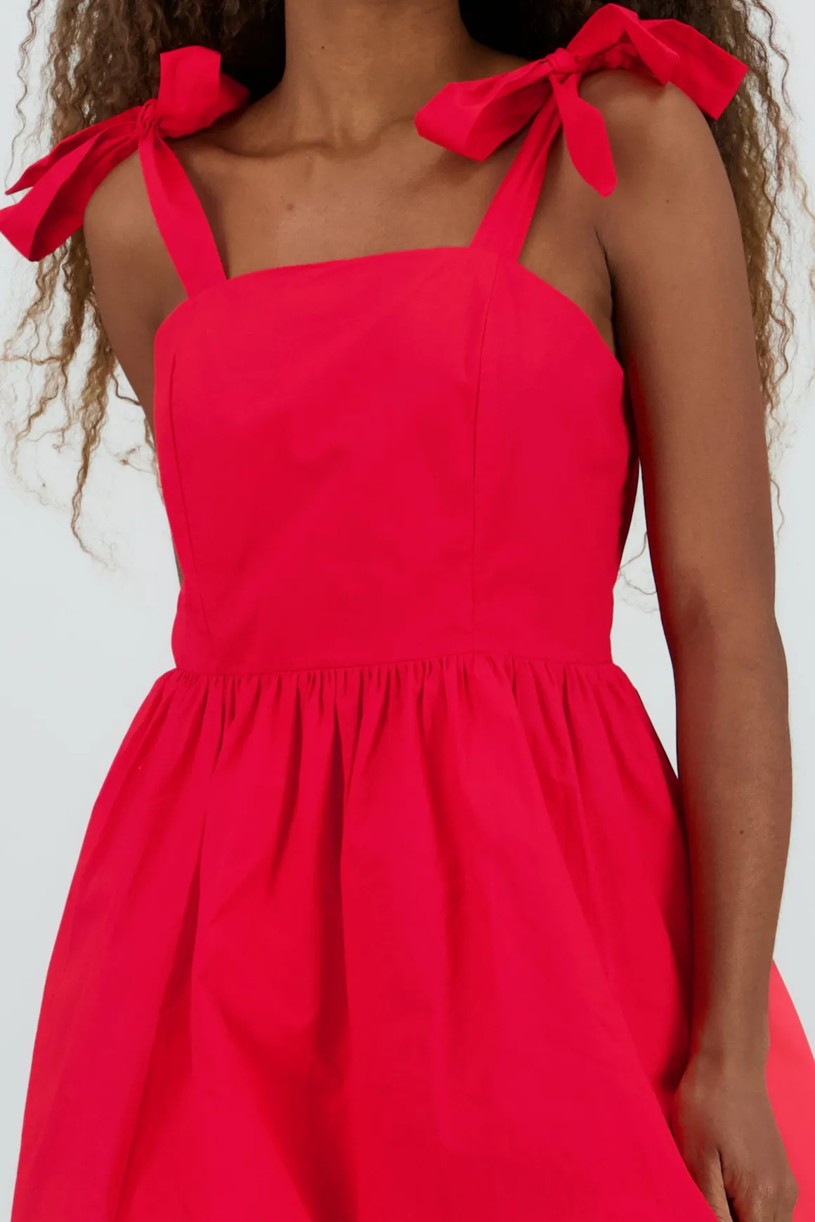 Vestido mini bubble, hombros descubiertos, tirantes ajustables y moños decorativos.