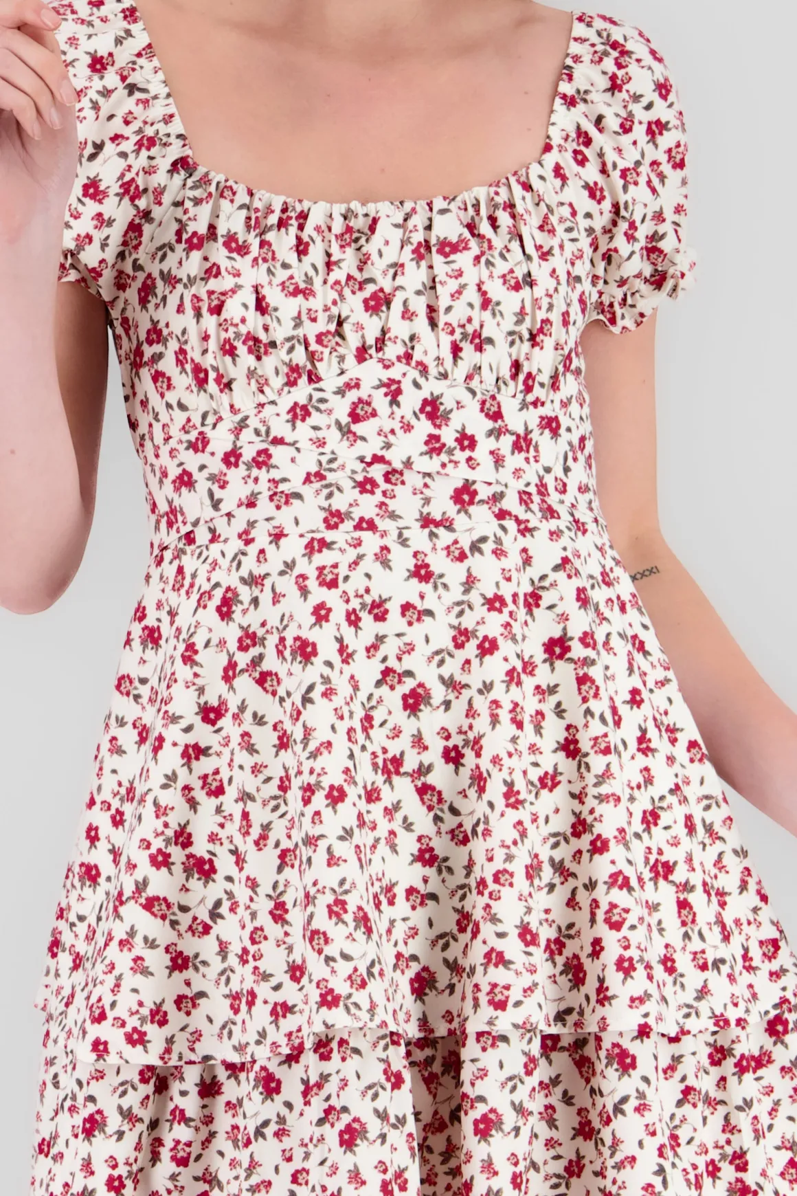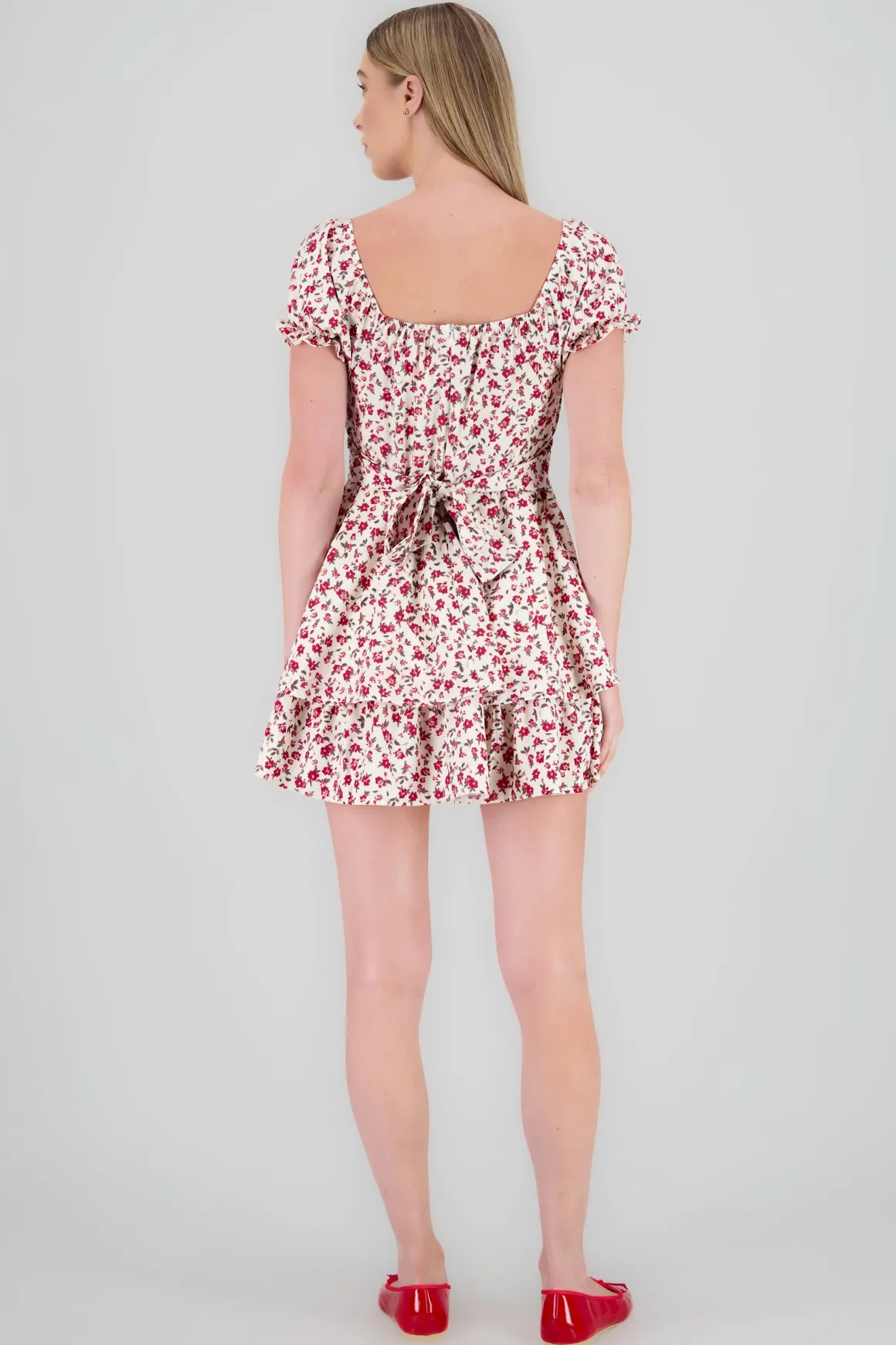 Este vestido presenta un hermoso estampado de flores, junto con un escote cuadrado tanto en la parte frontal como en la espalda. Las mangas cortas abullonadas añaden un toque de feminidad, mientras que la cinta ancha alrededor de la cintura, con un delicado moño en la espalda, realza la silueta de forma única. Este vestido es perfecto para lucir un look fresco y primaveral en cualquier ocasión.